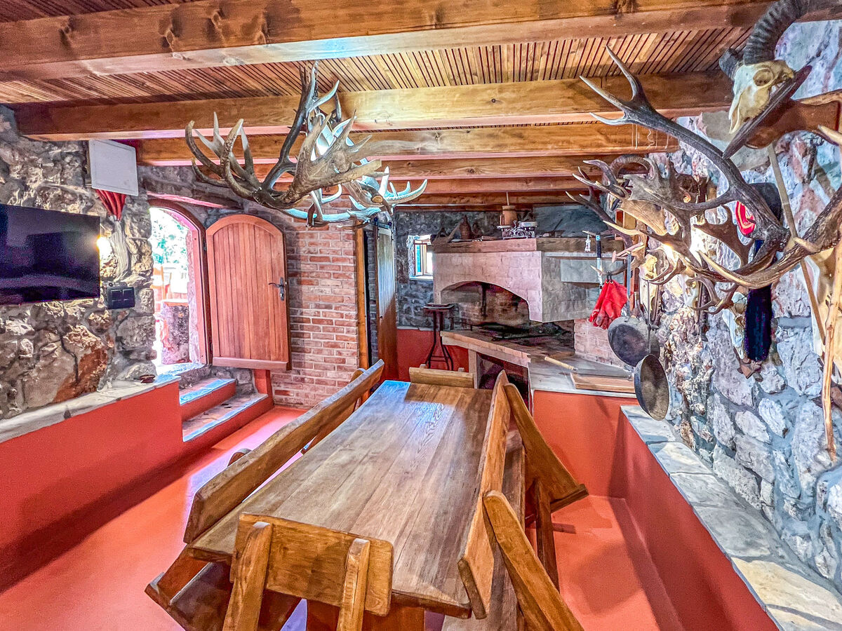 Aménagement rustique: séjour/salle à manger avec 1 divan-lit double (140 cm, longueur 190 cm), cheminée et TV (satellite) (écran plat), air-conditionné.