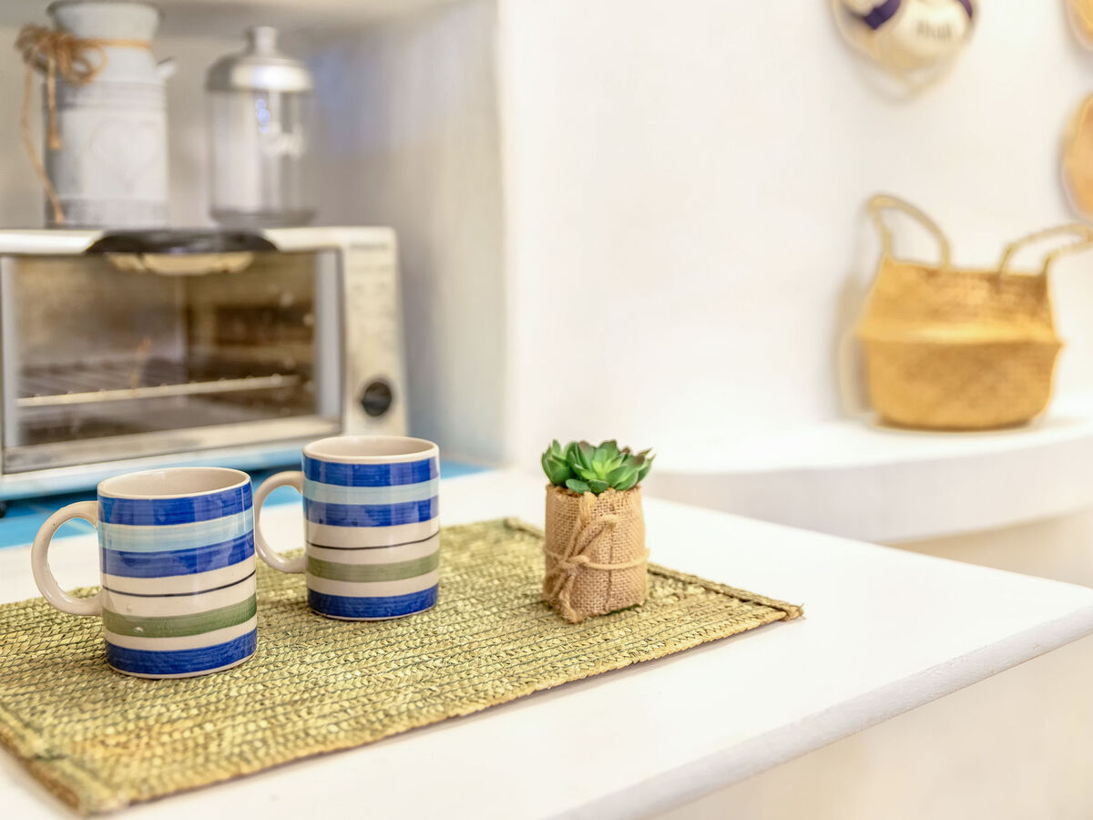 Coin cuisine (4 plaques de cuisson, mini-four, grille-pain, bouilloire électrique) avec petite table pour les repas, TV (écran plat).