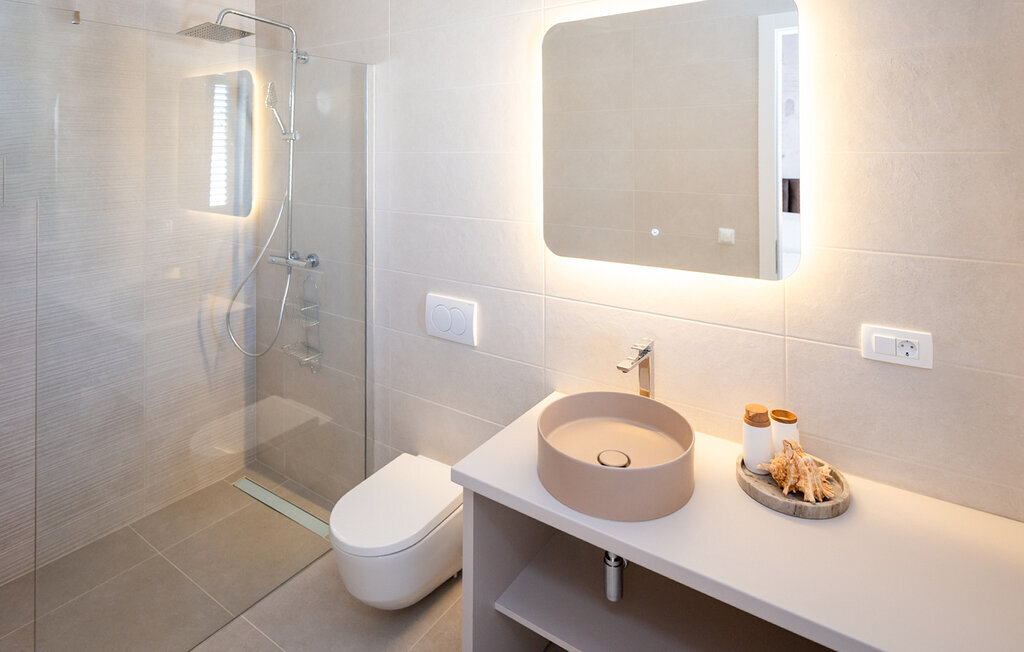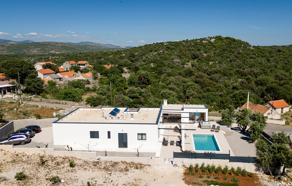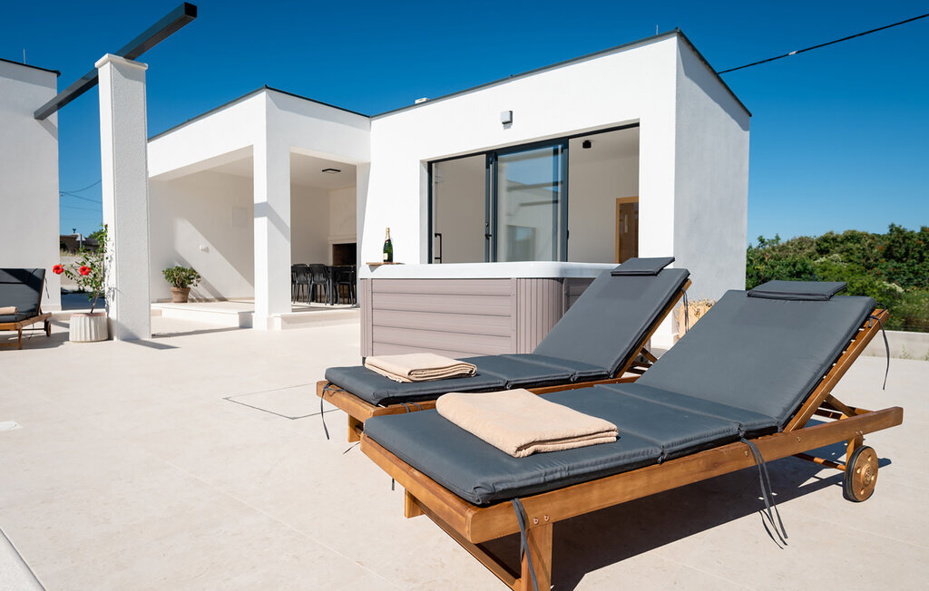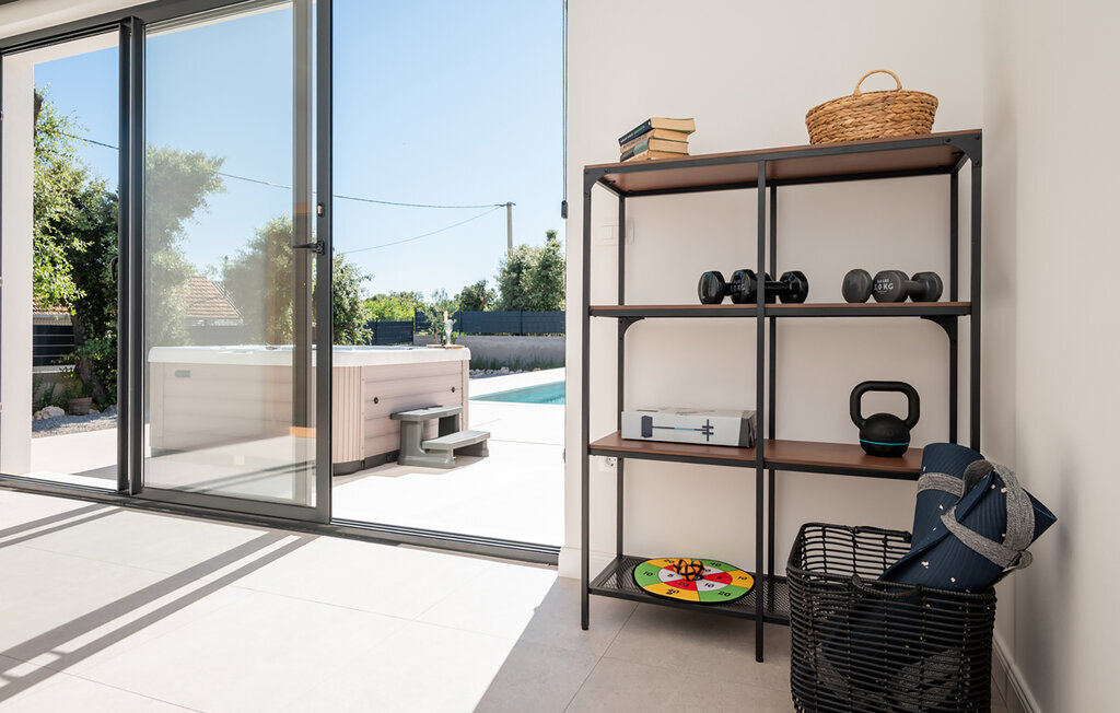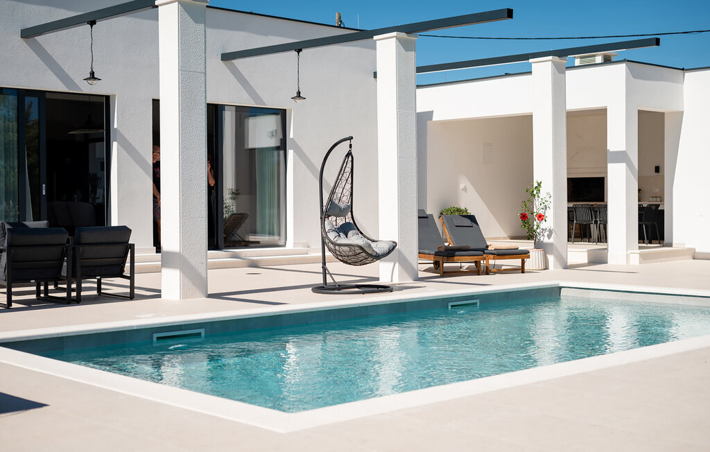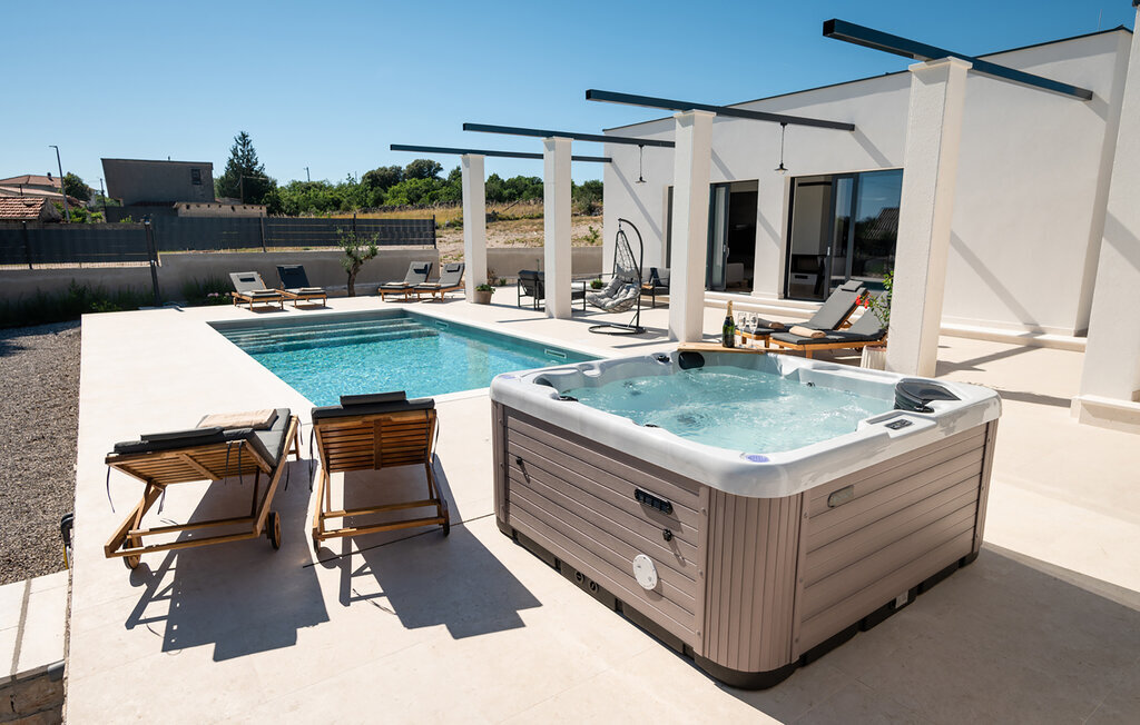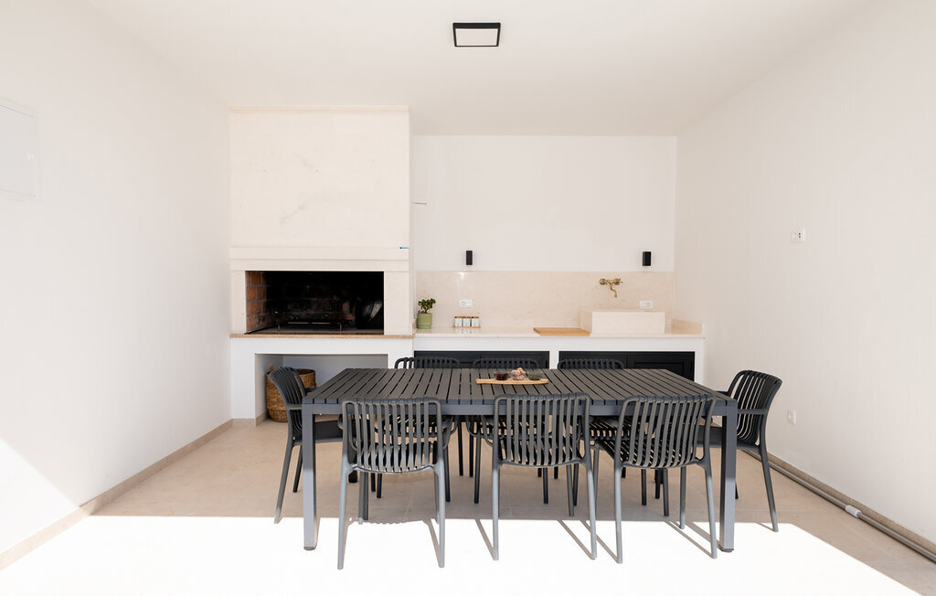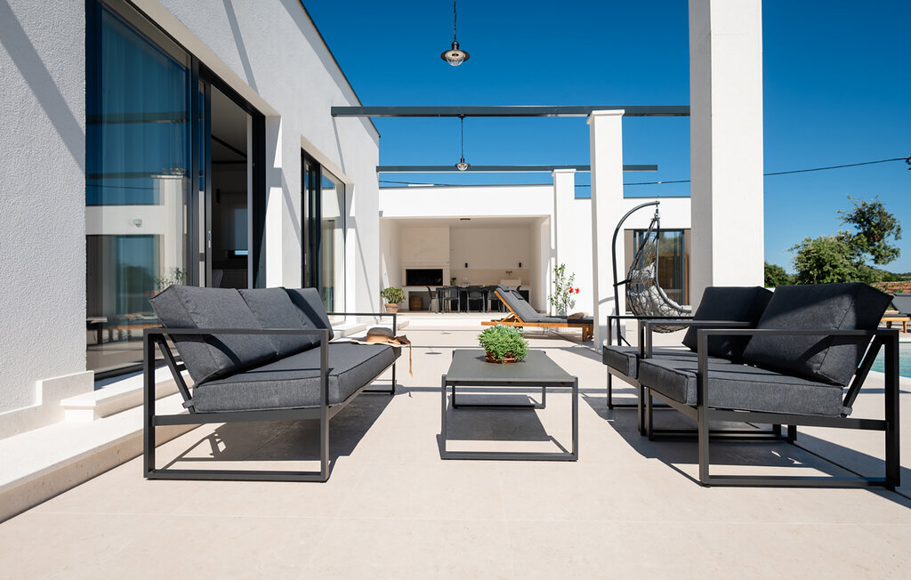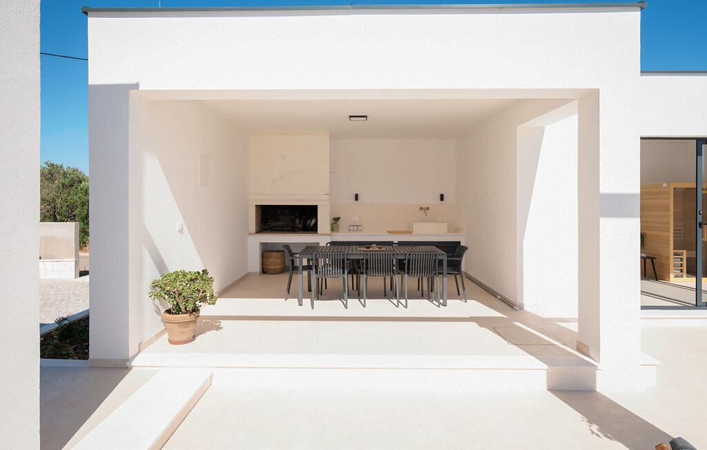 L'élégant et vaste espace extérieur est fait pour vous permettre de profiter pleinement du magnifique climat méditerranéen. Rafraîchissez-vous dans la piscine, offrez-vous des moments de bien-être dans le sauna et portez un toast aux moments passés ensemble dans le jacuzzi. Préparez des grillades pleines d'ambiance dans la cuisine d'été et discutez jusqu'au bout de la nuit avec du vin et à la lueur des bougies.