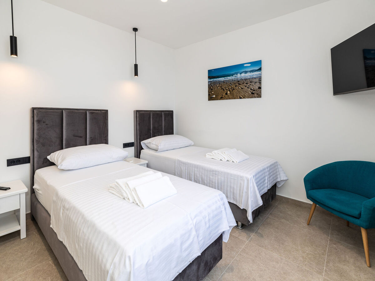 À l'étage supérieur: 1 chambre avec 2 lits (90 cm, longueur 200 cm), TV (satellite) et air-conditionné.