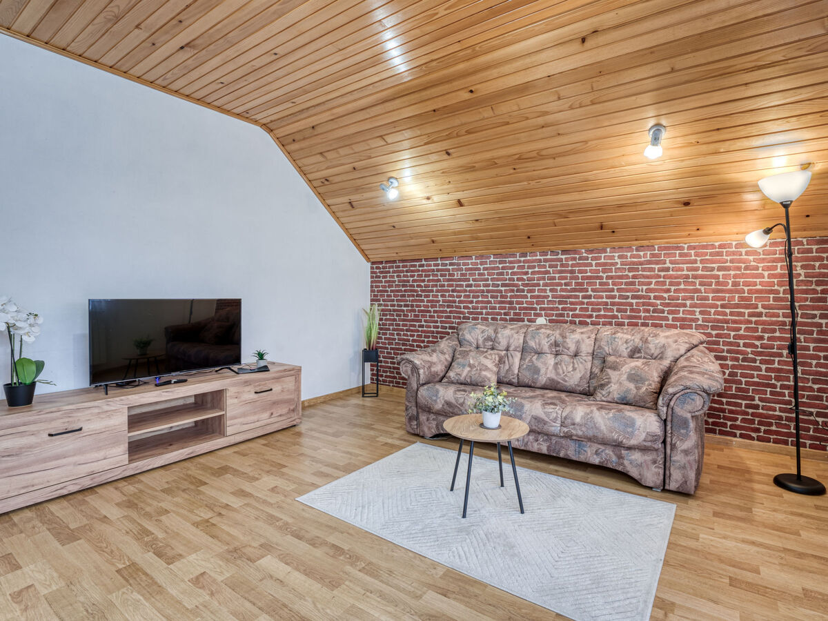 Sous le toit: séjour/salle à manger mansardé, hauteur plafond 140 - 270 cm avec TV (câblée).