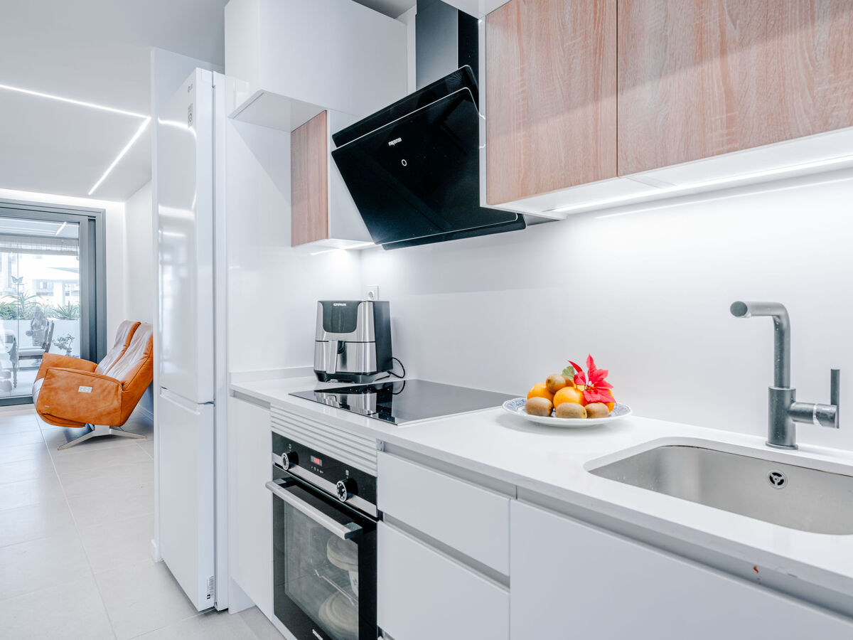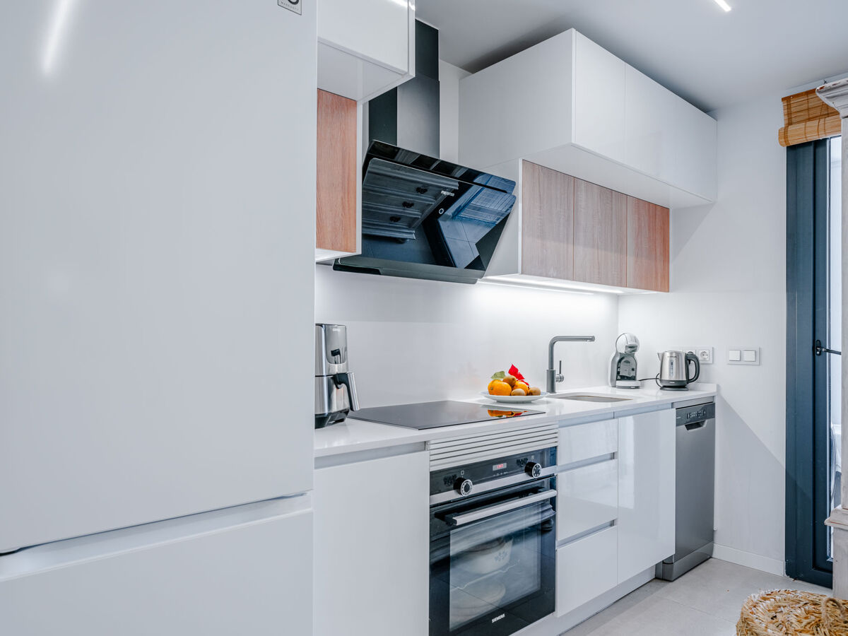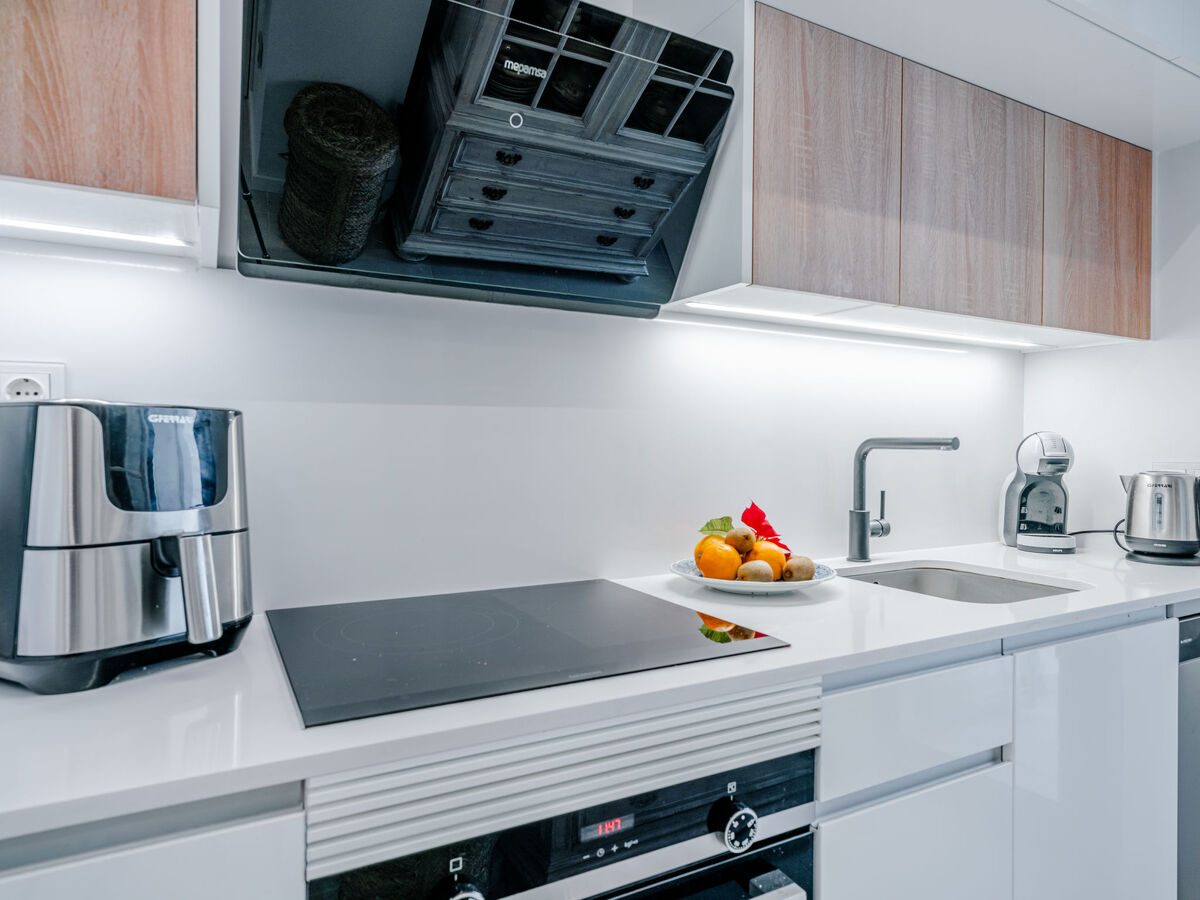 Cuisine ouverte (four, lave-vaisselle, 3 plaques à induction, grille-pain, bouilloire électrique, micro-ondes, congélateur, cafetière électrique, Capsules pour machine à café (Senseo) (NON INCLUSES)).