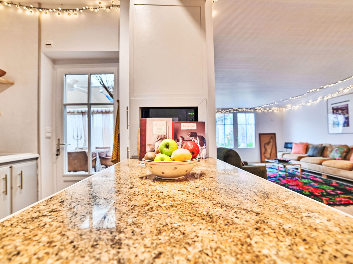 Cuisine ouverte (4 plaques de cuisson, four, grille-pain, bouilloire électrique, micro-ondes, cafetière électrique, ilot de cuisine).