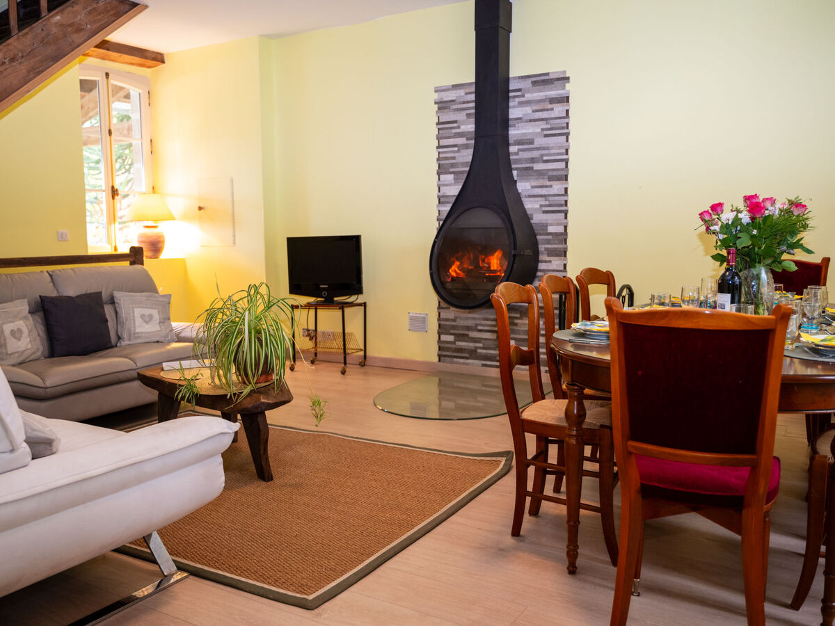Aménagement confortable et agréable: séjour/salle à manger avec poêle suédois, table pour les repas et TV (écran plat).