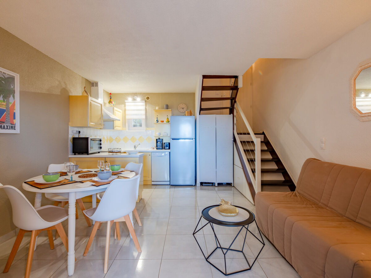 Aménagement plaisant: séjour/salle à manger avec 1 divan-lit double (1 x 130 cm, longueur 190 cm), TV (écran plat), radiateur électrique.