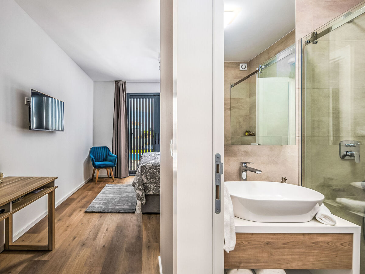 1 chambre avec 1 grand-lit (180 cm, longueur 200 cm), bain/WC, TV (satellite) et air-conditionné.