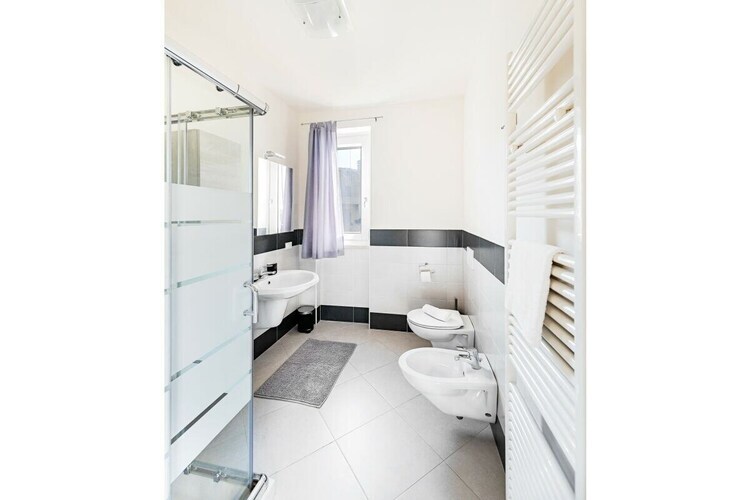 L'appartement se poursuit avec la chambre principale avec lit double et grands placards. La deuxième chambre avec lits superposés et la salle de bain avec douche, lavabo, WC et bidet complètent l'aménagement de ce grand et confortable appartement, idéal pour un séjour confortable sur le lac de Garde !