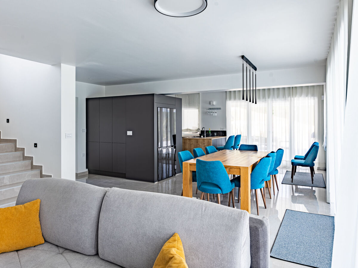 Cuisine ouverte (four, lave-vaisselle, 4 plaques à induction, grille-pain, bouilloire électrique, micro-ondes, congélateur, cafetière électrique).