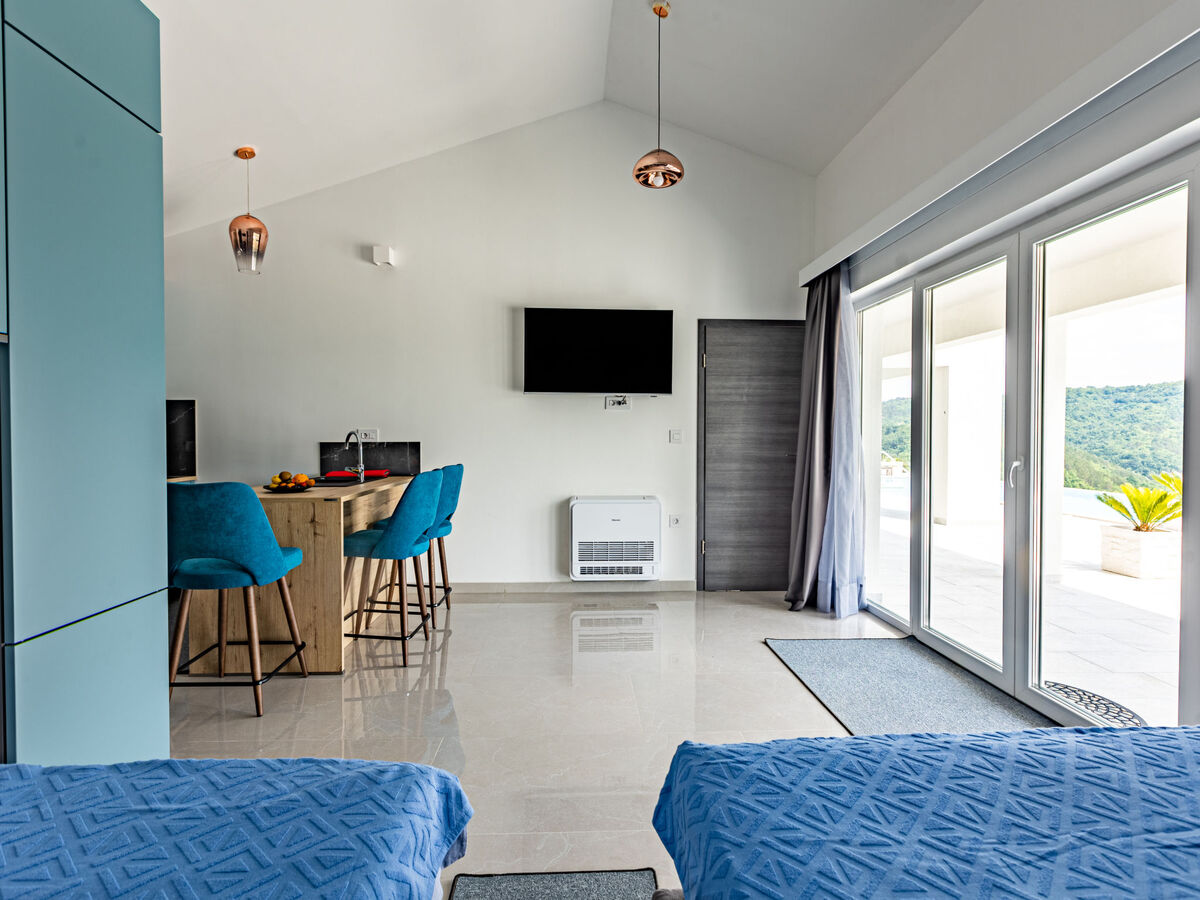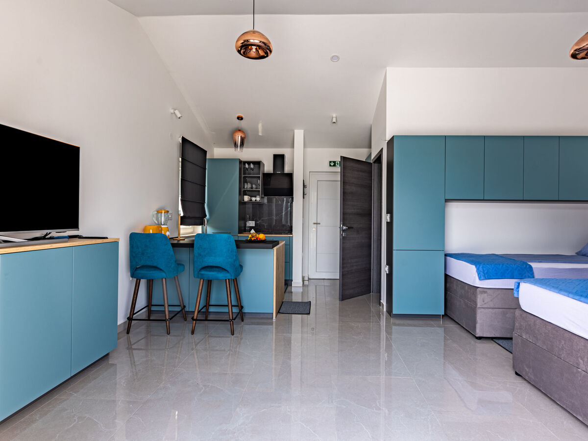 Studio avec 1 lit (90 cm, longueur 200 cm), 1 grand-lit (160 cm, longueur 200 cm), coin-cuisine, douche/WC, TV (satellite) et air-conditionné.