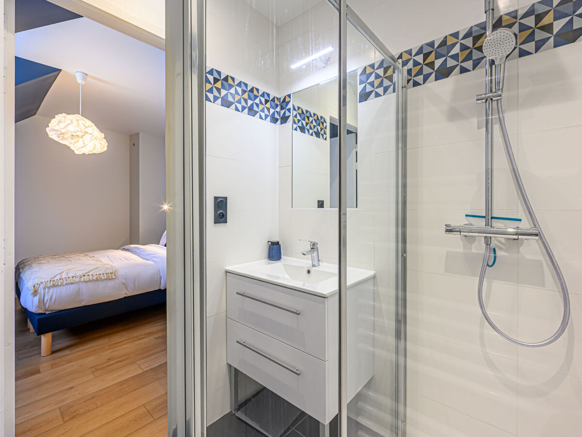 2ème étage: salon avec TV (écran plat) avec 1 grand-lit (1 x 140 cm, longueur 190 cm), douche.