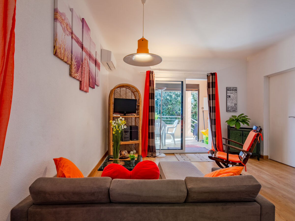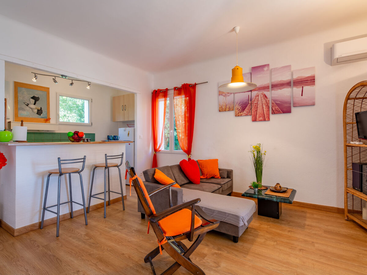 Aménagement plaisant: séjour/salle à manger avec baie vitrée avec TV (écran plat), chaîne stéréo et air-conditionné.