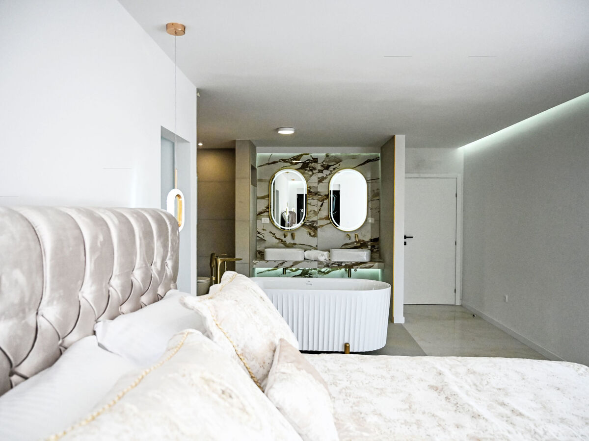 1 chambre avec 1 grand-lit (180 cm, longueur 200 cm), bain/WC.