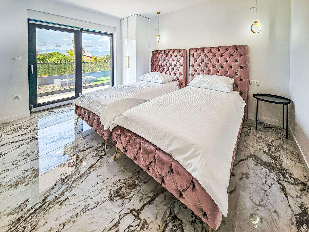 Sortie sur le balcon avec 2 lits et 1 grand-lit.