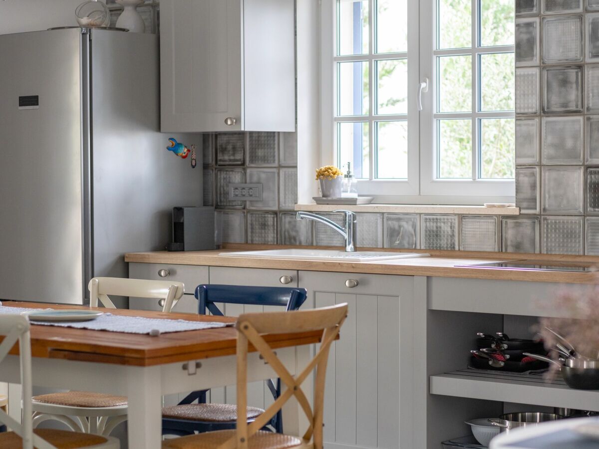 Cuisine ouverte (four, lave-vaisselle, 4 plaques vitrocéramiques, grille-pain, congélateur, cafetière électrique).
