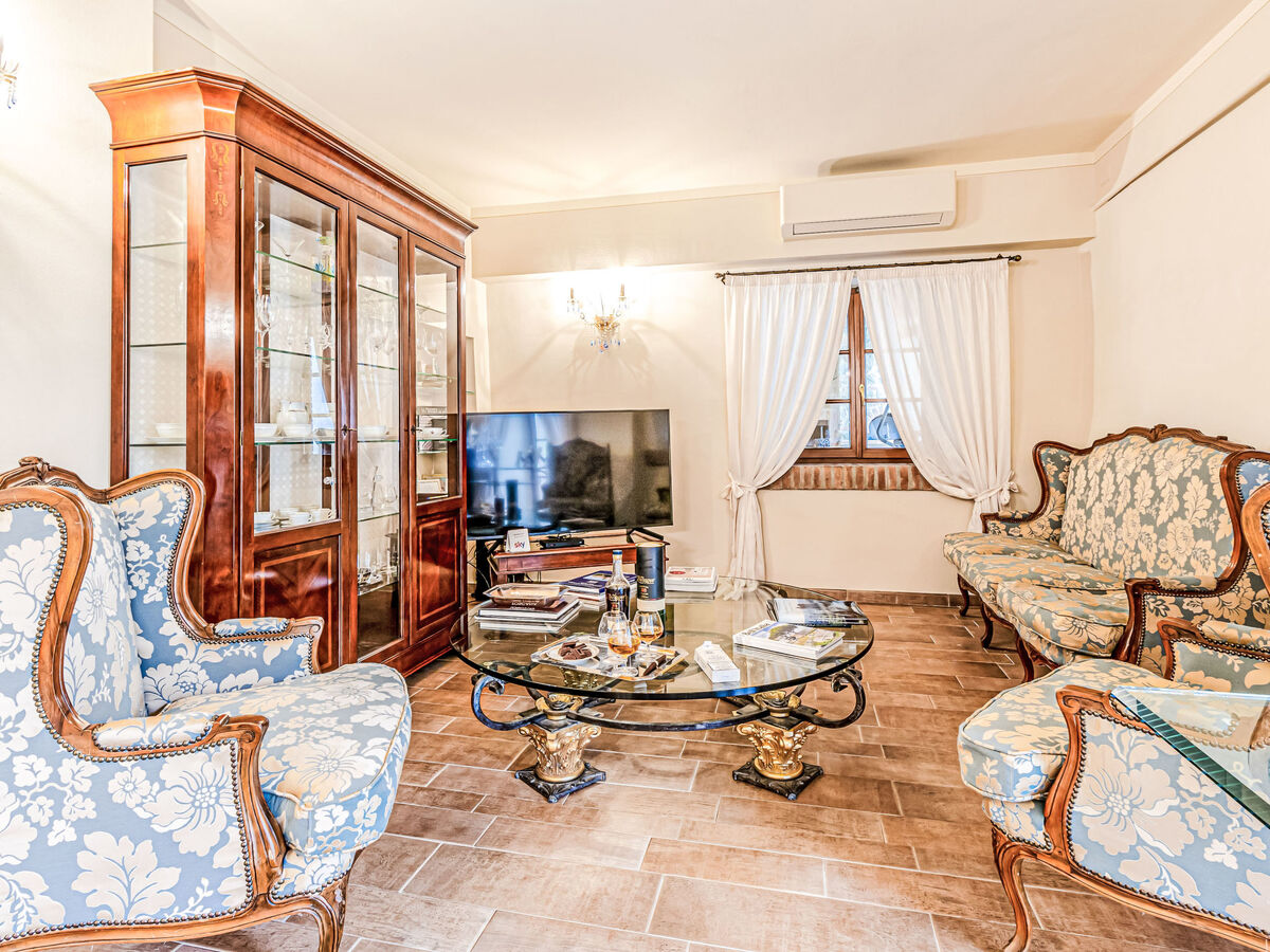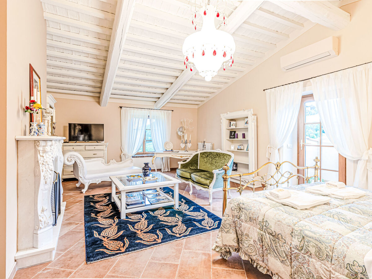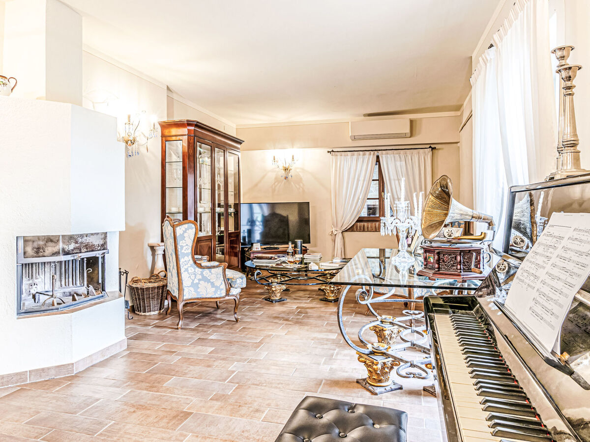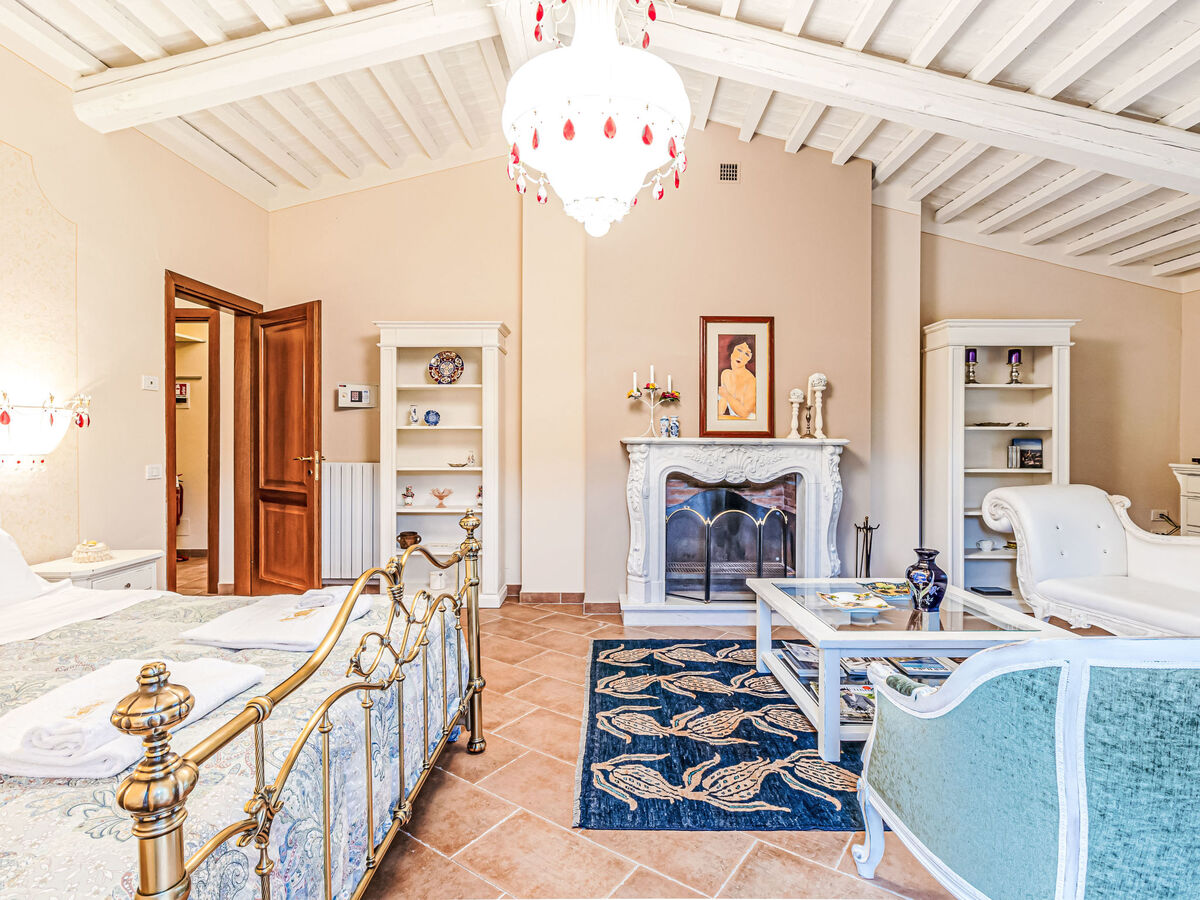 Aménagement confortable et de style: séjour avec cheminée, salle de bains et TV (satellite) (écran plat).