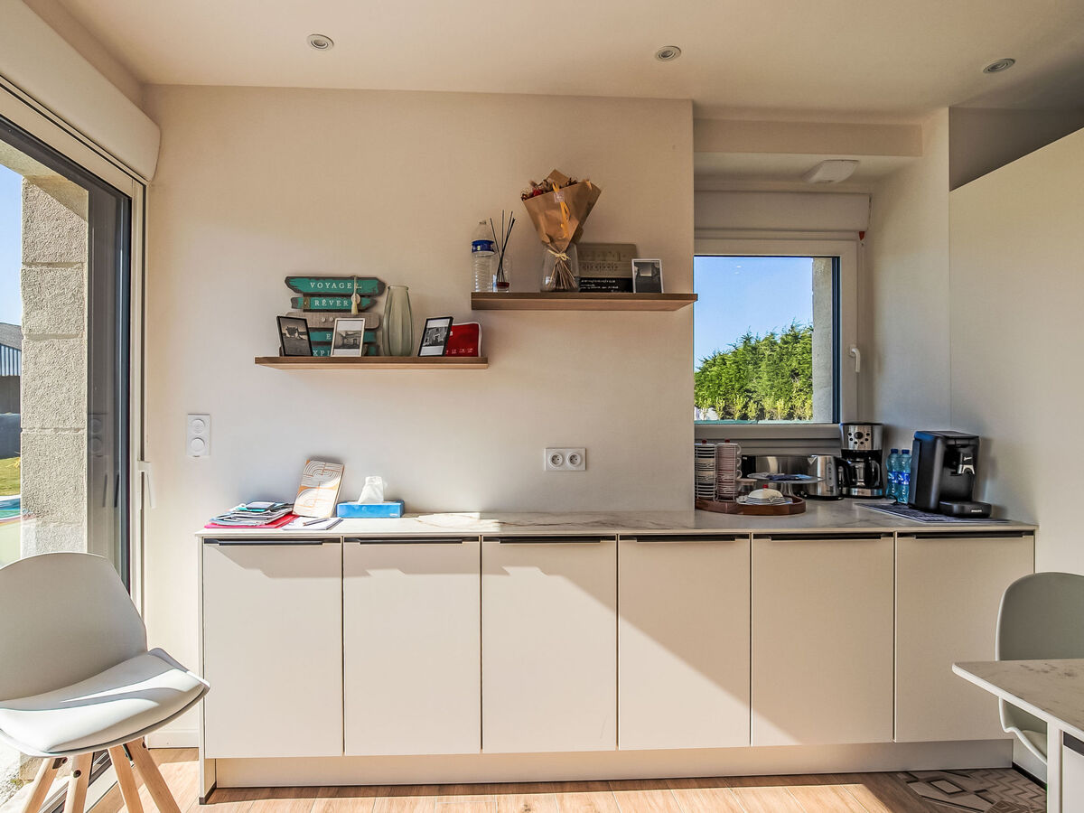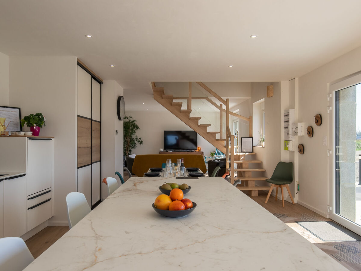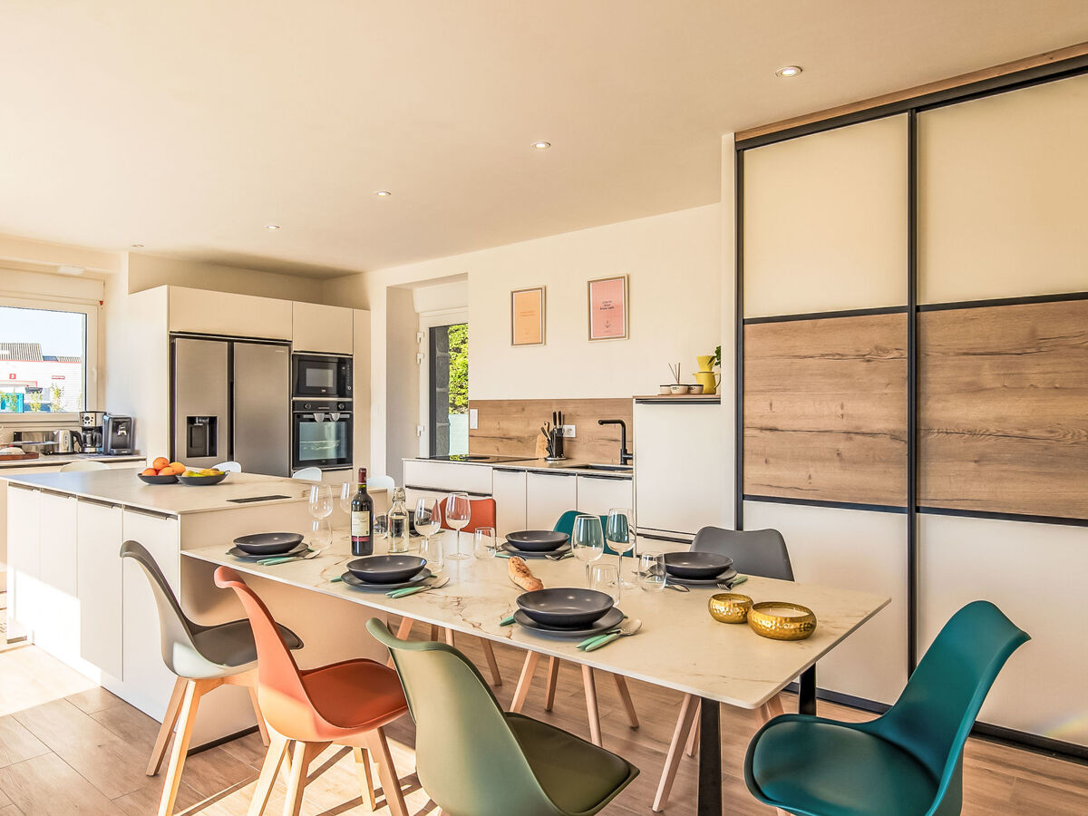 Grande cuisine ouverte 35 m2 (four, lave-vaisselle, 4 plaques à induction, grille-pain, bouilloire électrique, micro-ondes, congélateur, cafetière électrique, ilot de cuisine) avec table pour les repas.