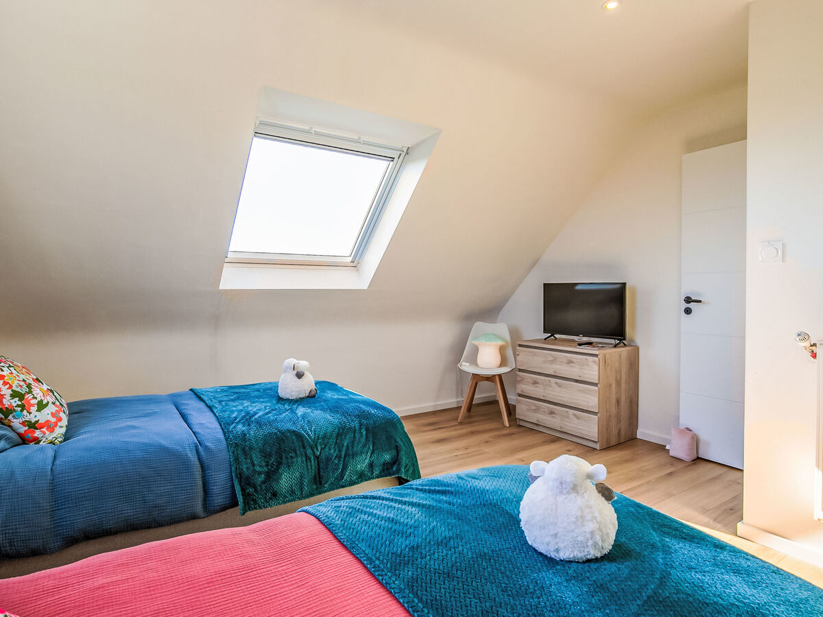 À l'étage supérieur: 1 chambre 15 m2, mansardée avec 2 lits (90 cm, longueur 200 cm), TV (écran plat).