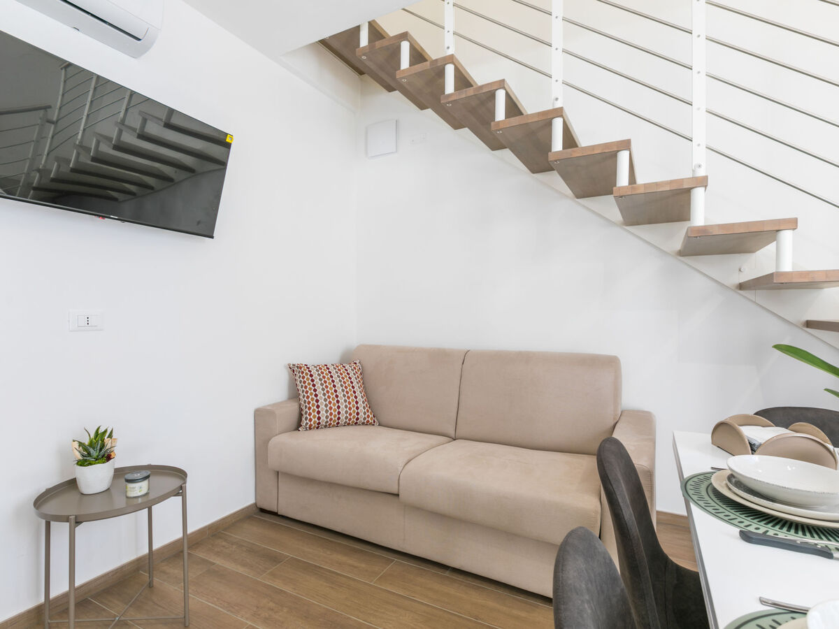 Complètement rénovée en 2025, aménagement confortable et de bon goût: séjour/chambre à coucher avec 1 divan-lit, table pour les repas et TV.