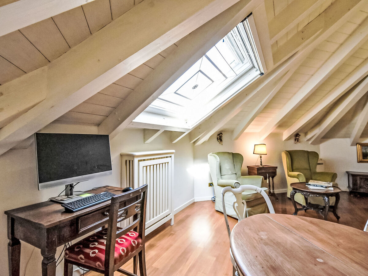 À l'étage supérieur: grande galerie ouverte avec fenêtre sous le toit avec 1 divan-lit double et ordinateur portable.