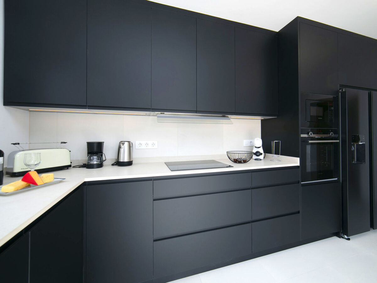 Cuisine (four, lave-vaisselle, 4 plaques à induction, grille-pain, bouilloire électrique, micro-ondes, congélateur, cafetière électrique) avec ventilateur.