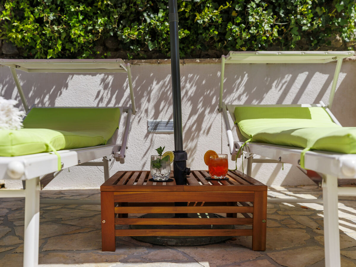 Douche extérieure, terrasse (6 m2), meubles de jardin.