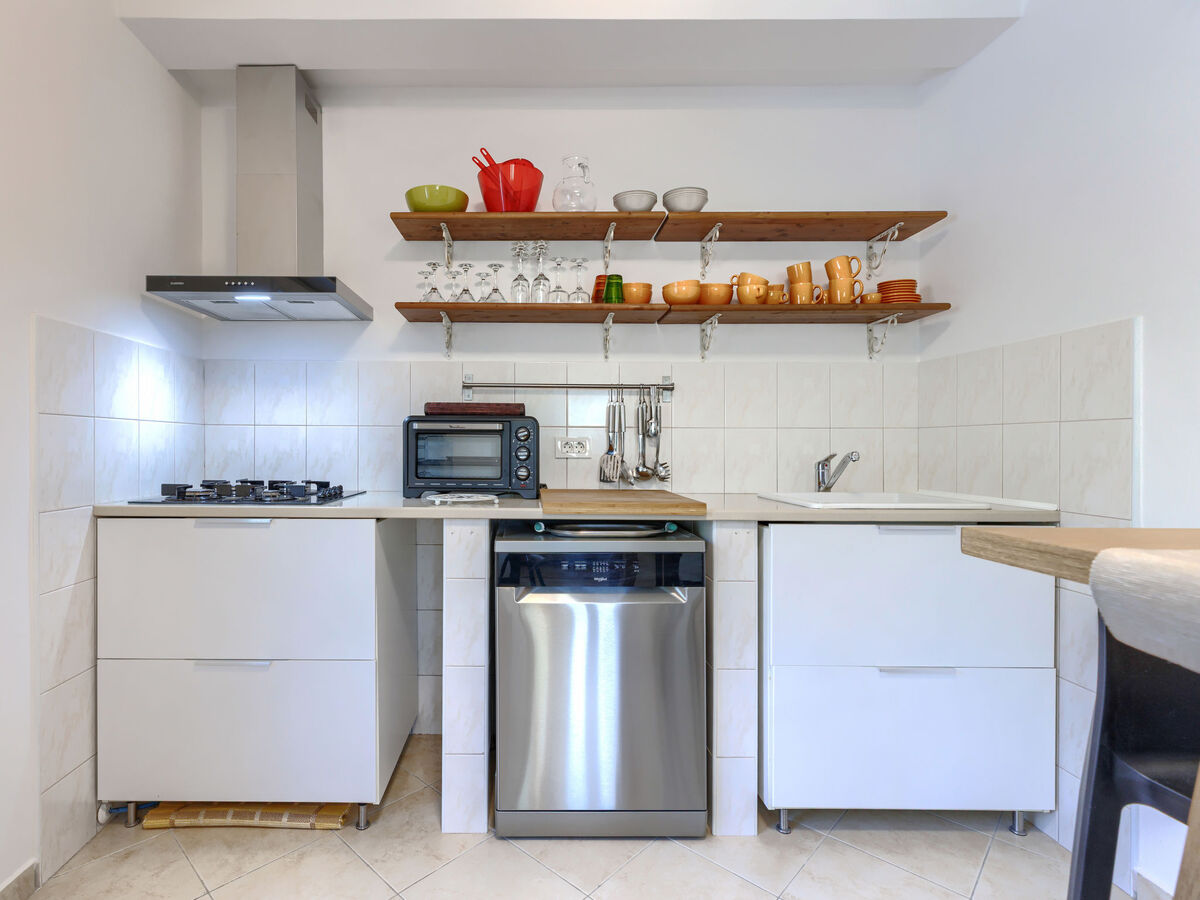 Cuisine ouverte (four, lave-vaisselle, 2 plaques vitrocéramiques, grille-pain, bouilloire électrique, congélateur, cafetière électrique).