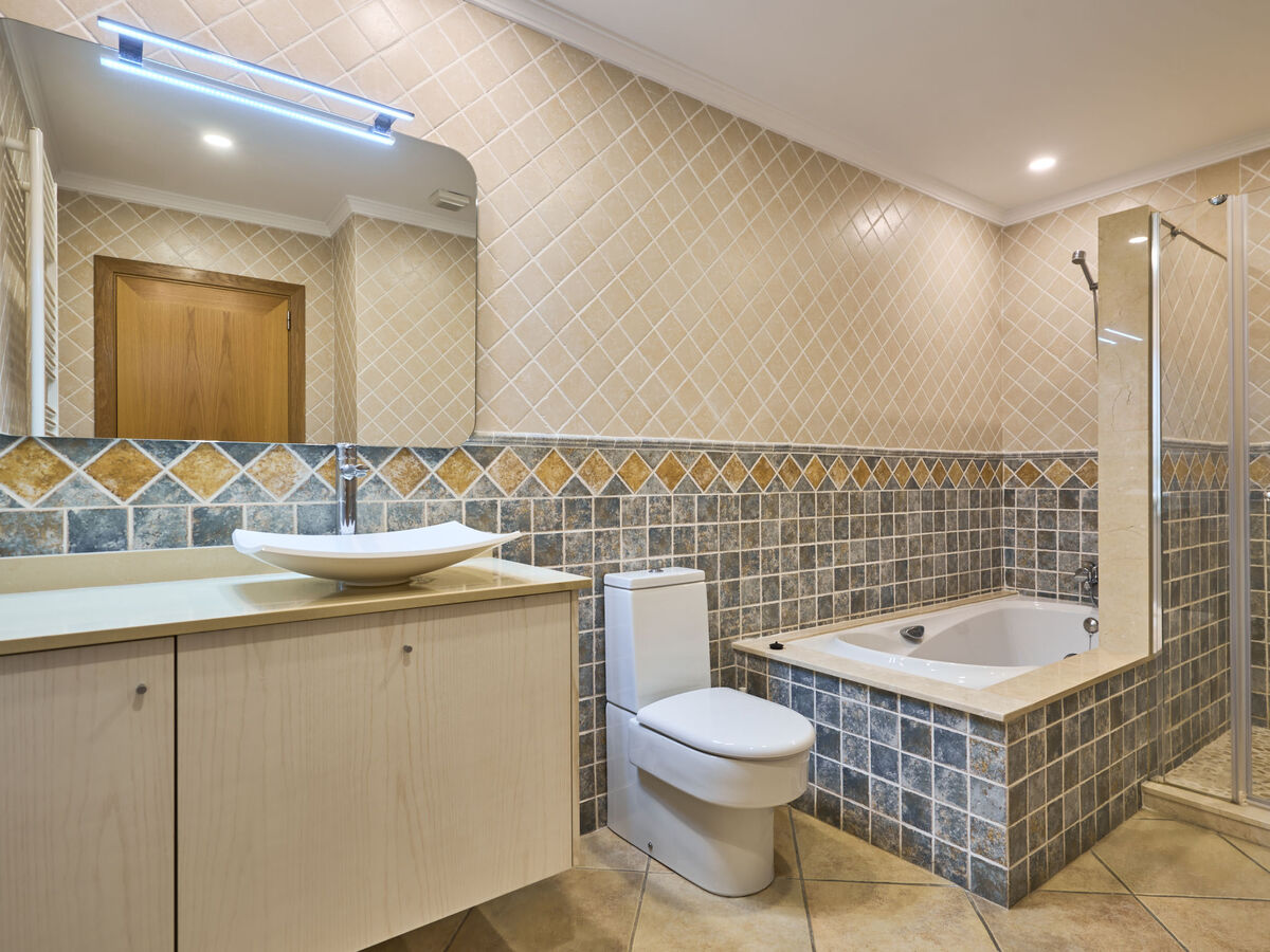 WC dans l'espace piscine, douche extérieure, pergola, terrasse, meubles de jardin, barbecue.