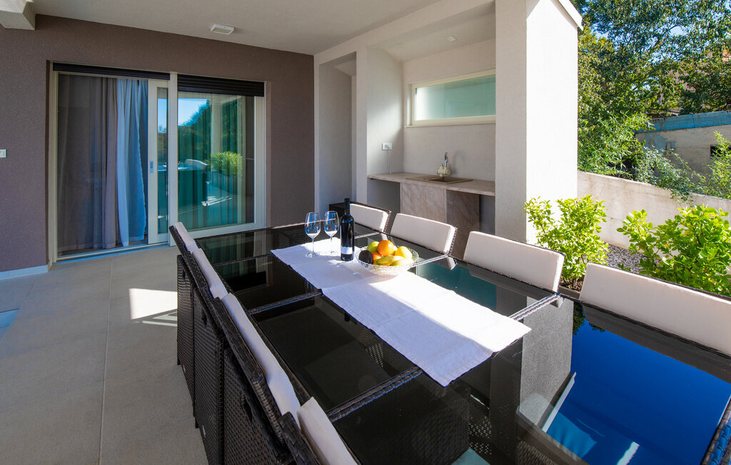 La grande terrasse ensoleillée offre une vue impressionnante sur la mer. Rafraîchissez-vous dans la magnifique piscine, faites le plein d'énergie sur la chaise longue et célébrez les douces nuits d'été avec un barbecue en plein air plein d'ambiance.