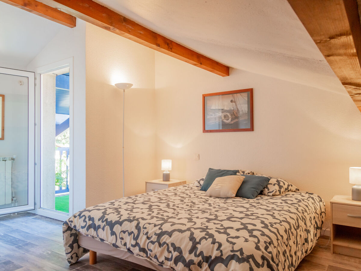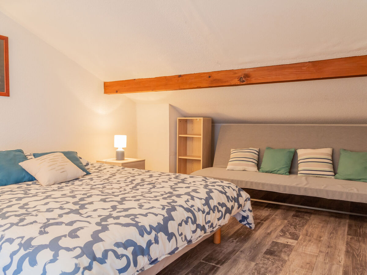 À l'étage supérieur: 1 chambre avec 1 grand-lit (140 cm, longueur 190 cm).