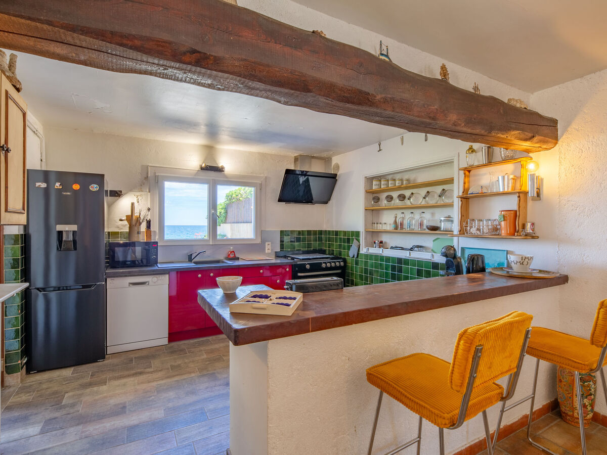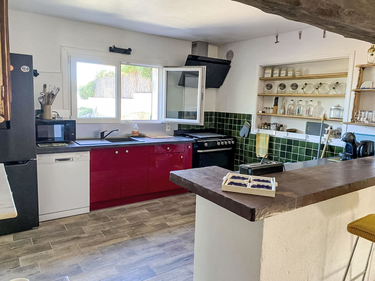 Grande cuisine ouverte (four, lave-vaisselle, 4 feux, grille-pain, bouilloire électrique, micro-ondes, congélateur, cafetière électrique, Capsules pour machine à café (DOLCE GUSTO) (NON INCLUSES)) avec bar.