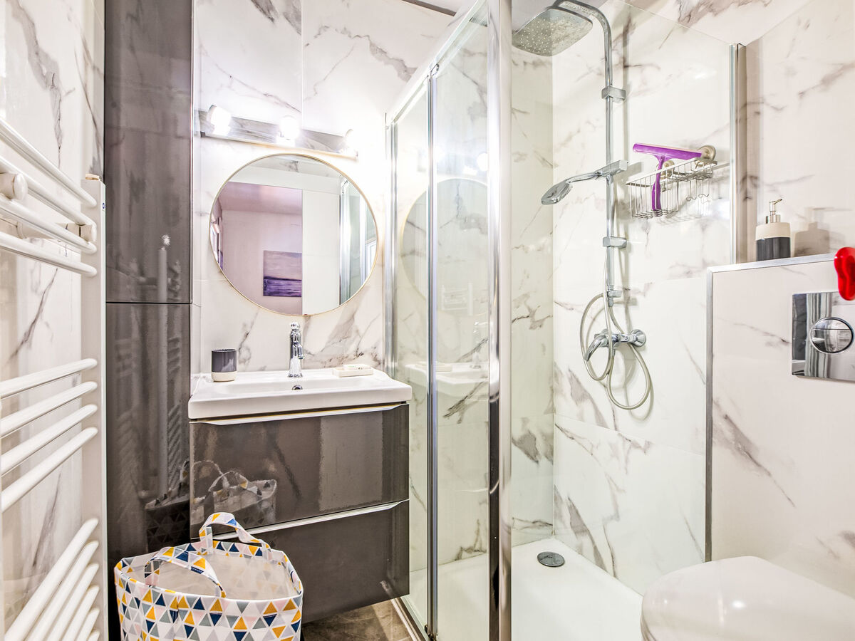 1 grande chambre avec 1 grand-lit (2 x 90 cm, longueur 200 cm), douche/WC et ventilateur.