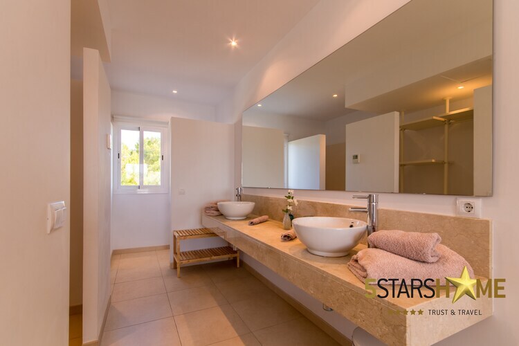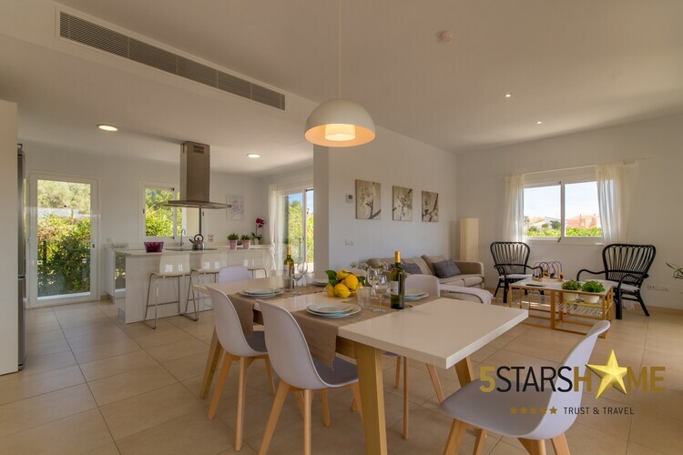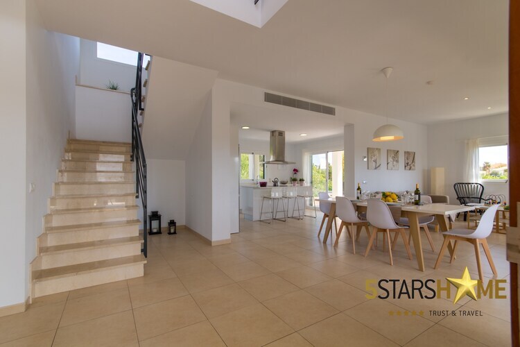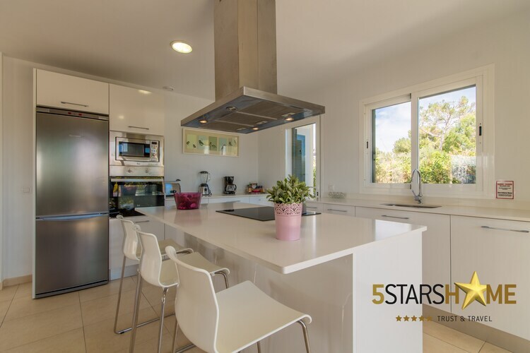 La villa, d'une superficie de 212 m², est répartie sur deux étages et comprend un séjour ouvert et lumineux avec des sièges confortables et une grande salle à manger. L'élégante cuisine est entièrement équipée et comprend un bar, idéal pour les repas décontractés. De grandes baies vitrées coulissantes s'ouvrent directement sur le jardin et la piscine, créant une harmonie parfaite entre l'intérieur et l'extérieur. Des équipements pour bébé, tels que des lits et des chaises hautes, sont disponibles sur demande, ce qui rend cette maison idéale pour les familles de tous âges.