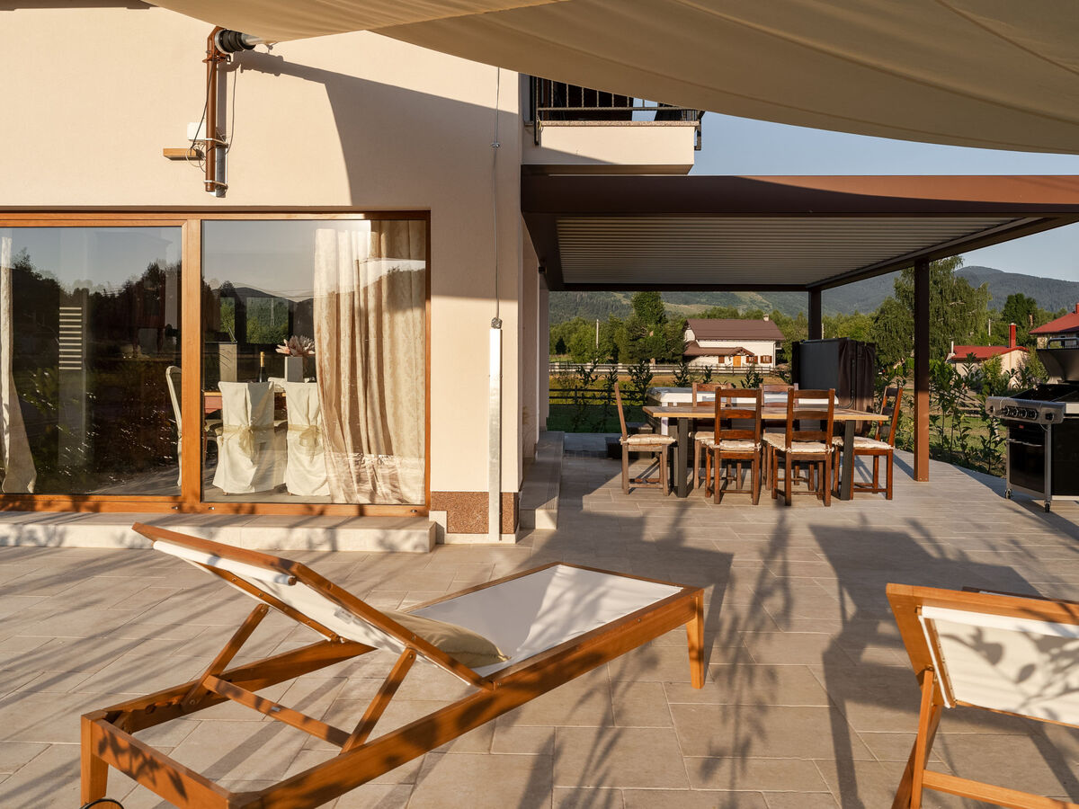 Meubles de terrasse, mobilier de balcon, barbecue électrique, chaises longues.