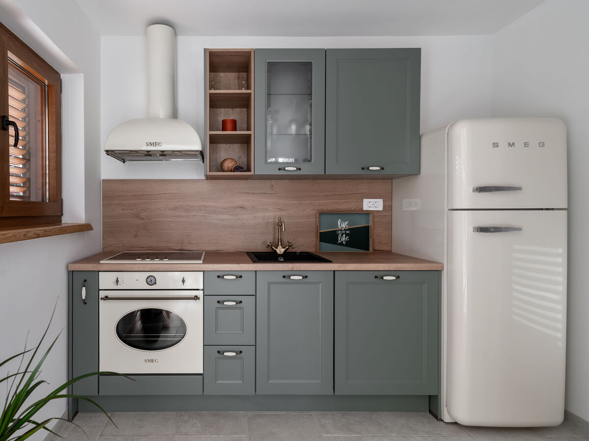 Cuisine ouverte (four, lave-vaisselle, 4 plaques vitrocéramiques, grille-pain, bouilloire électrique, congélateur, cafetière électrique).