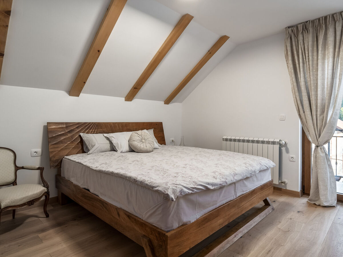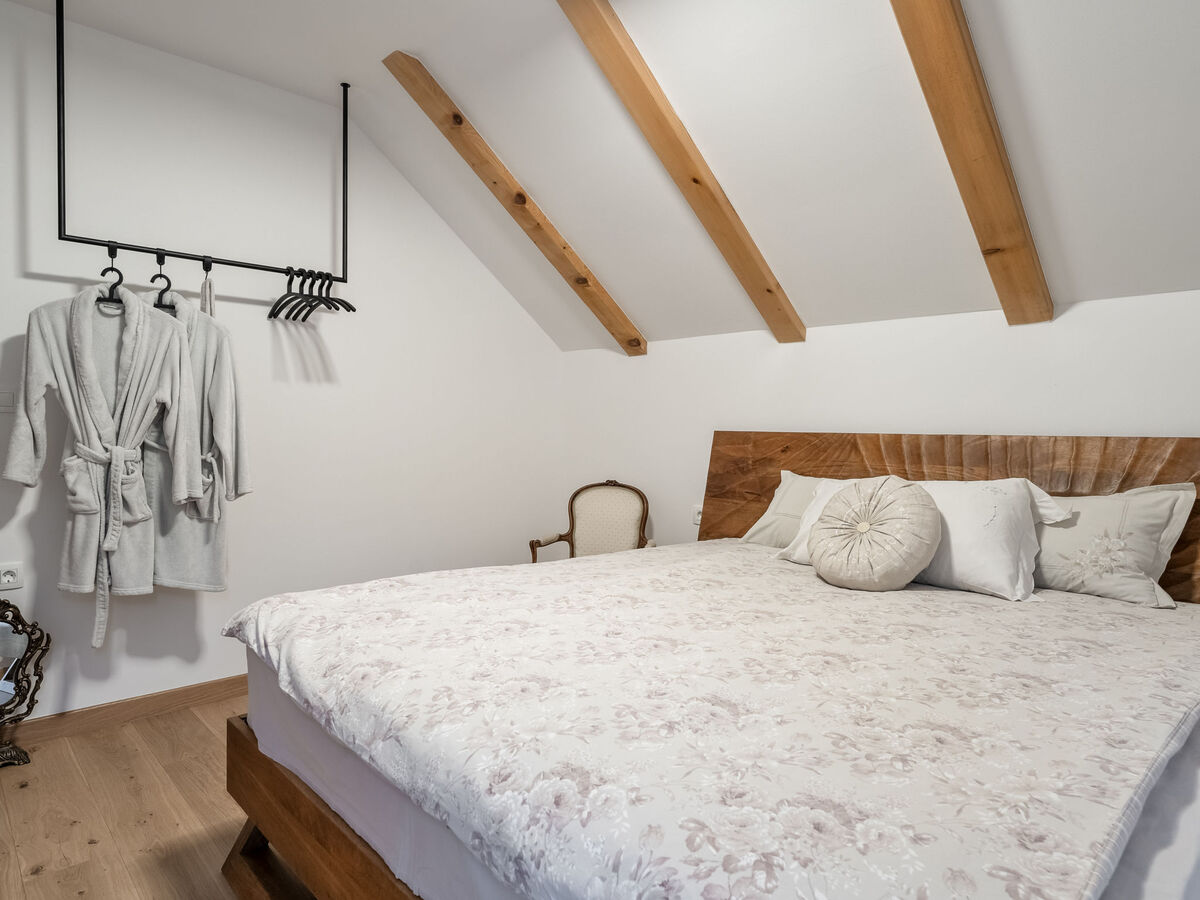 Sous le toit: 1 chambre, mansardée hauteur plafond 140 - 230 cm, sans armoire avec 1 grand-lit (180 cm, longueur 200 cm).
