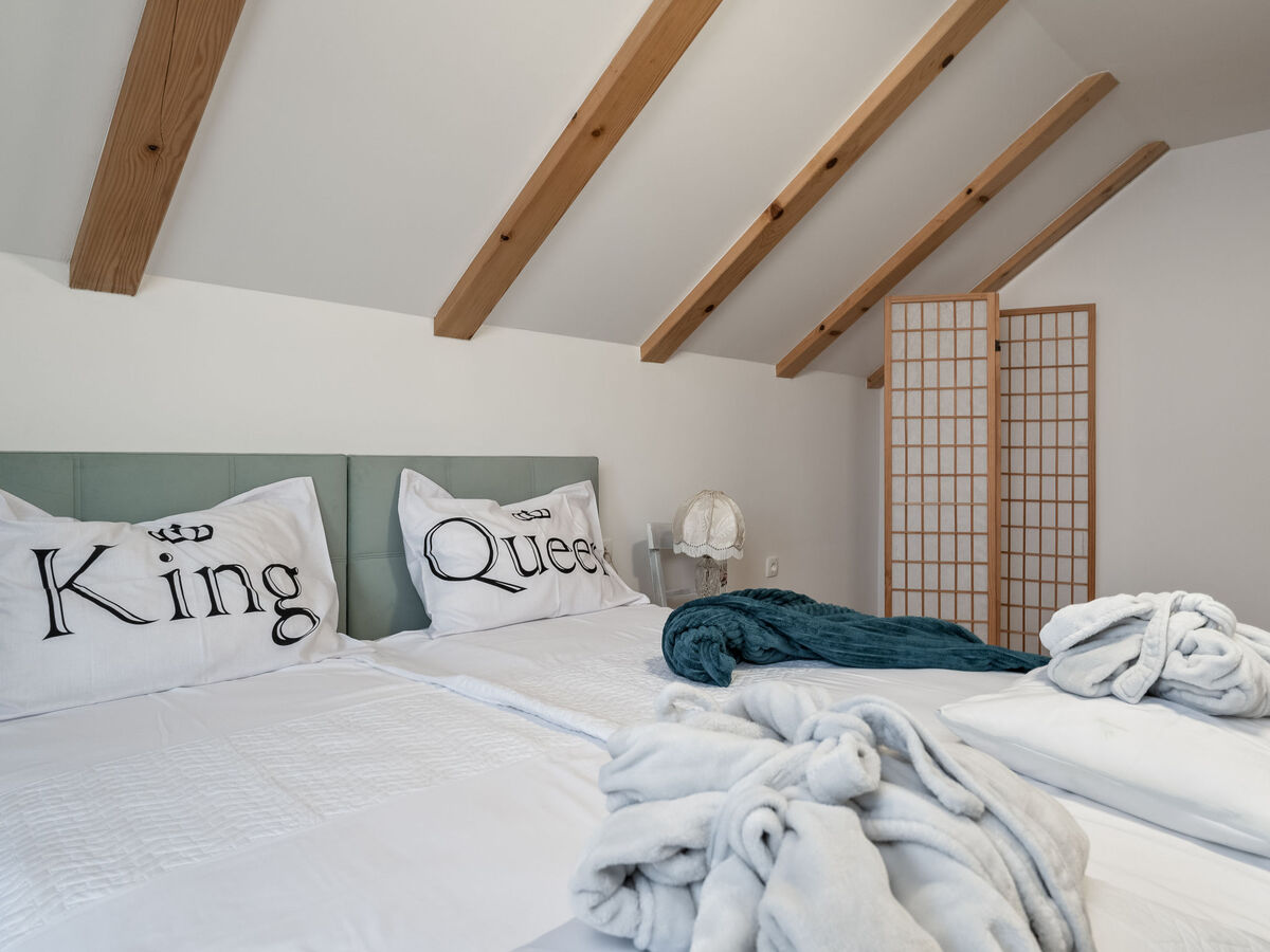 1 chambre, mansardée hauteur plafond 140 - 230 cm, sans armoire avec 2 lits (90 cm, longueur 200 cm).