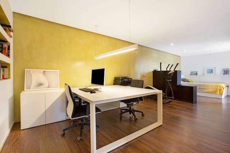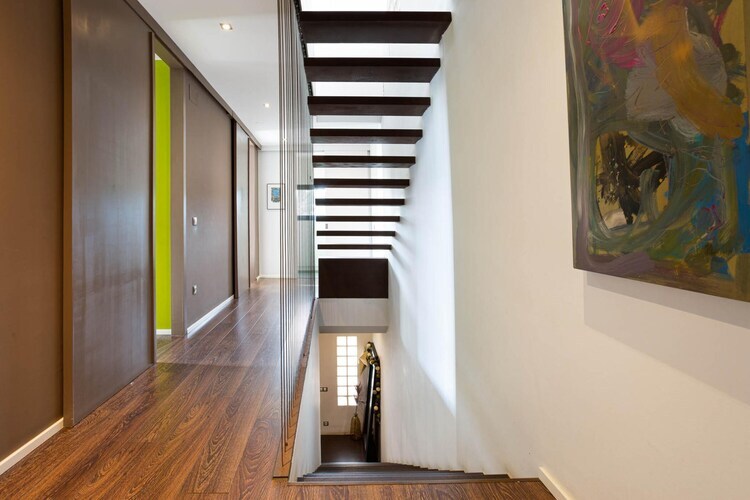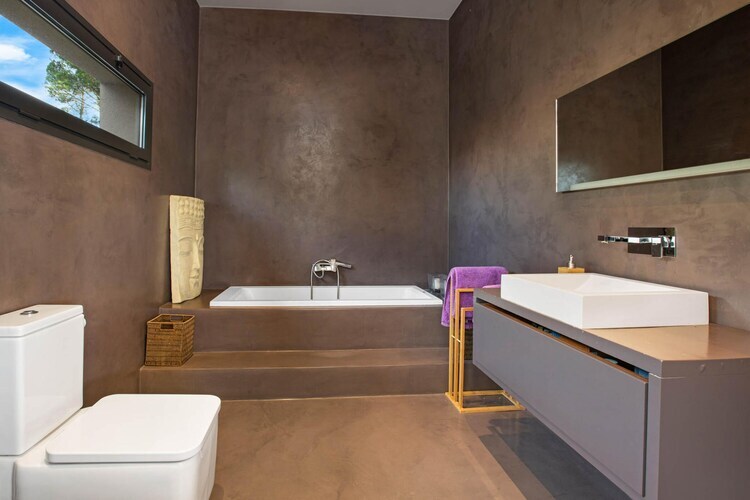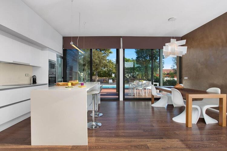 À l'intérieur de la villa, les espaces de vie spacieux sont répartis sur trois étages, avec deux escaliers intérieurs. La cuisine moderne, dotée d'un grand îlot et d'un coin petit-déjeuner, est entièrement équipée de tous les appareils nécessaires, dont un four, un micro-ondes, un lave-vaisselle et un lave-linge. La maison comprend également une salle de bains avec baignoire et une autre avec douche.