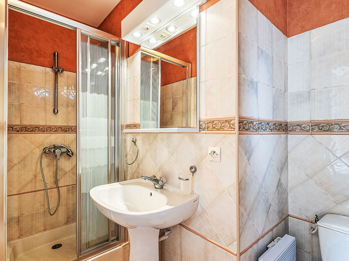 1 chambre avec 1 grand-lit (140 cm, longueur 190 cm), lavabo et douche/WC.