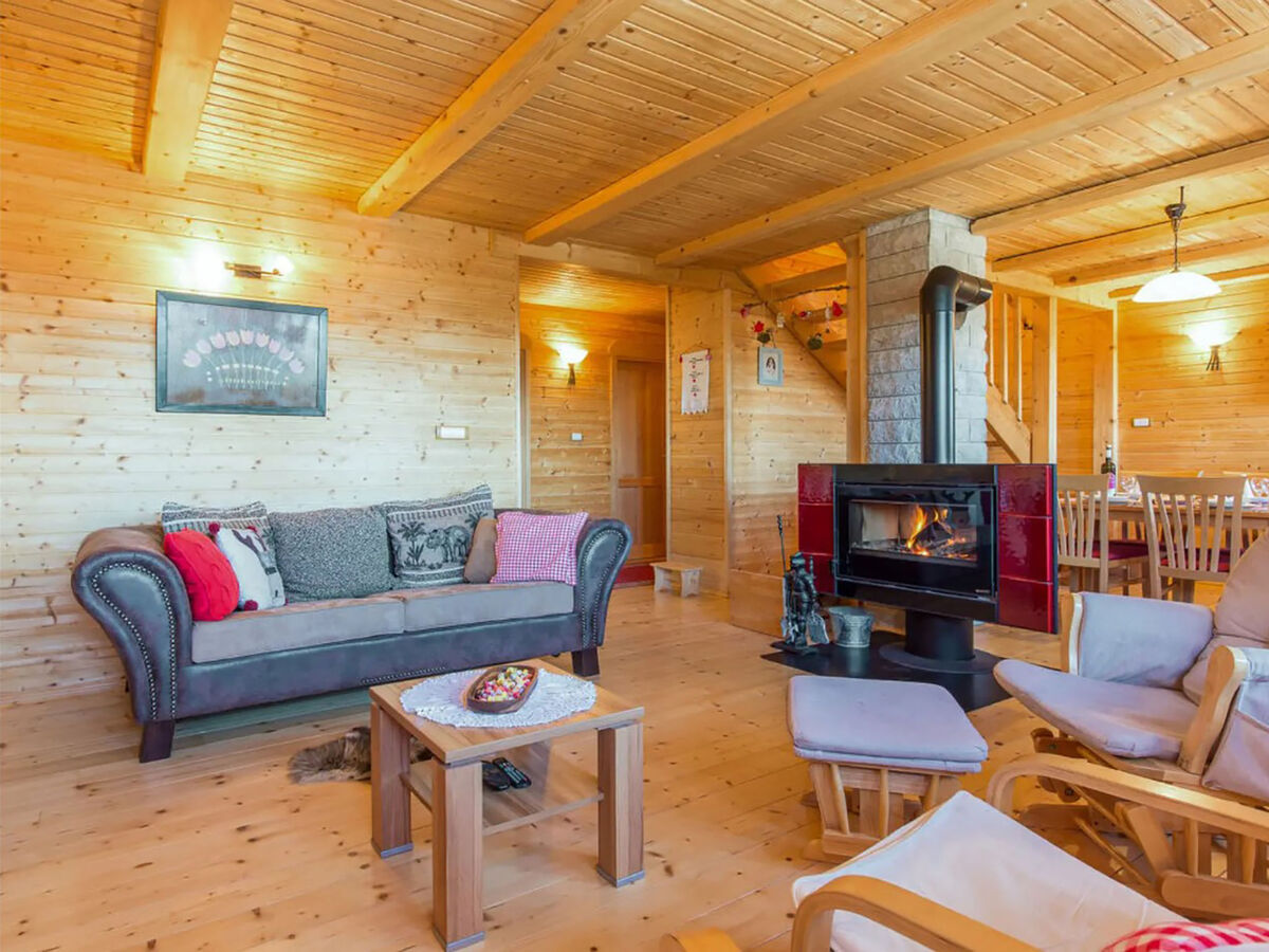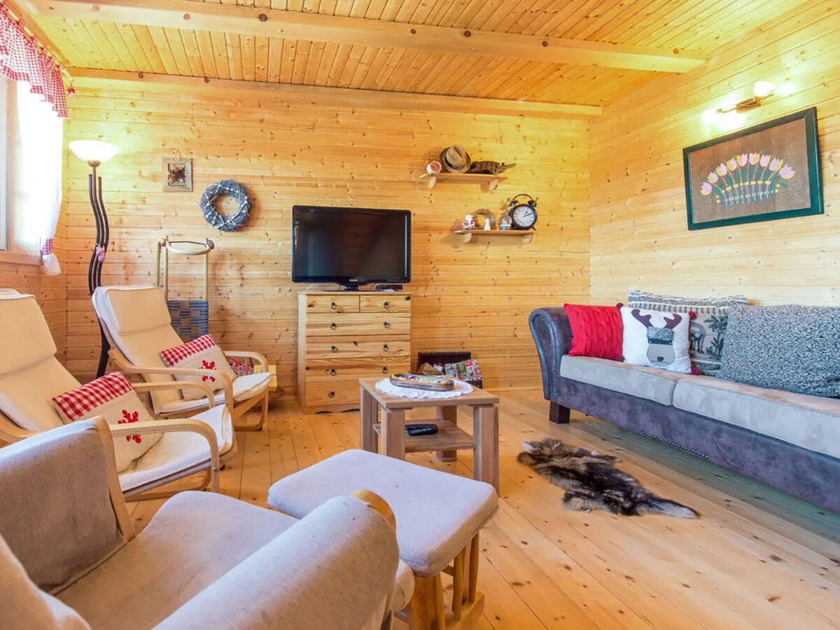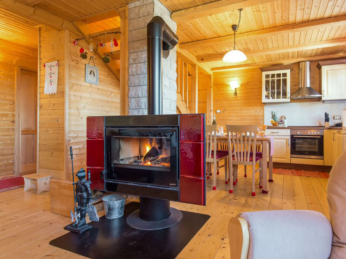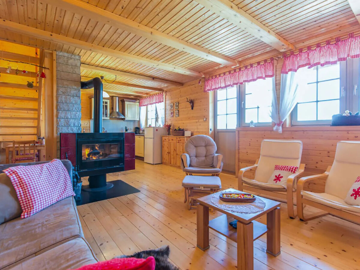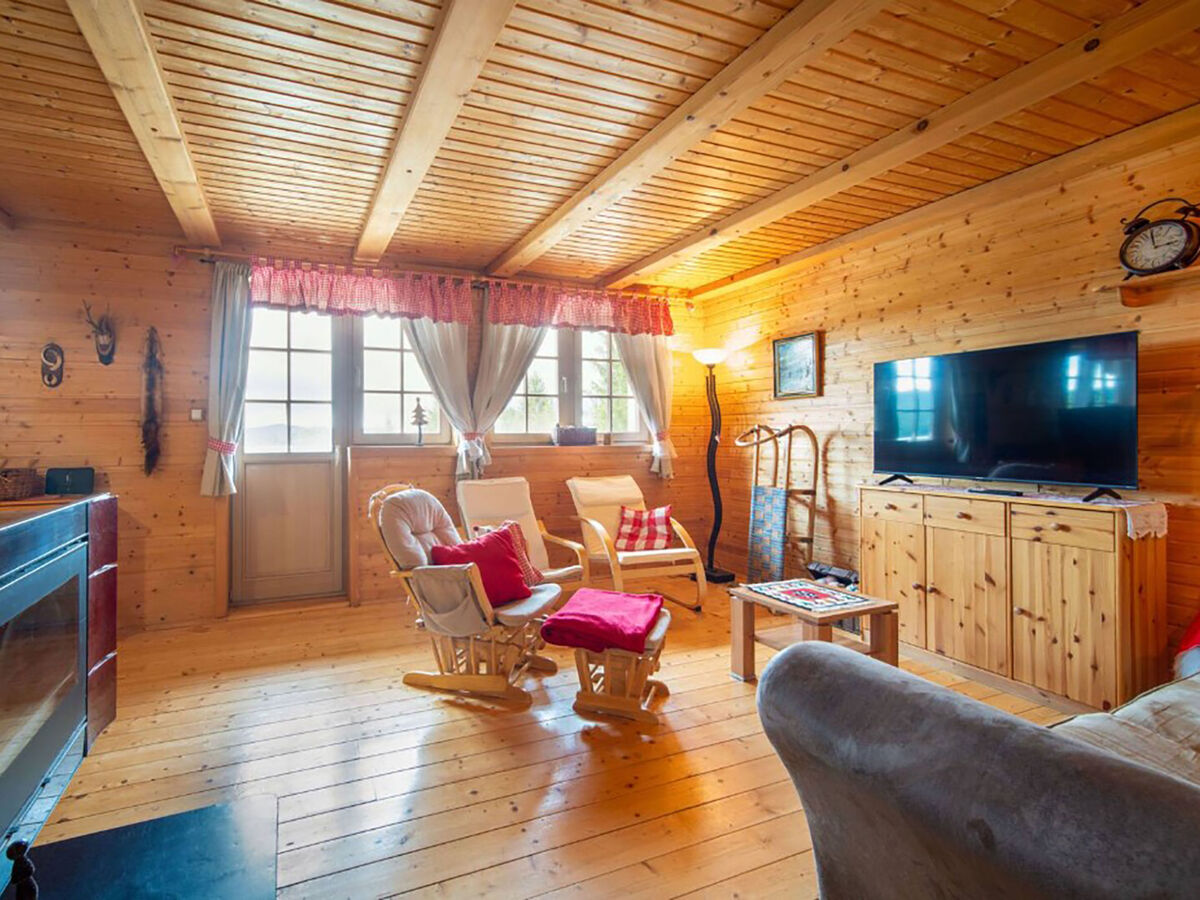 Séjour/salle à manger avec TV (écran plat), poêle à bois.