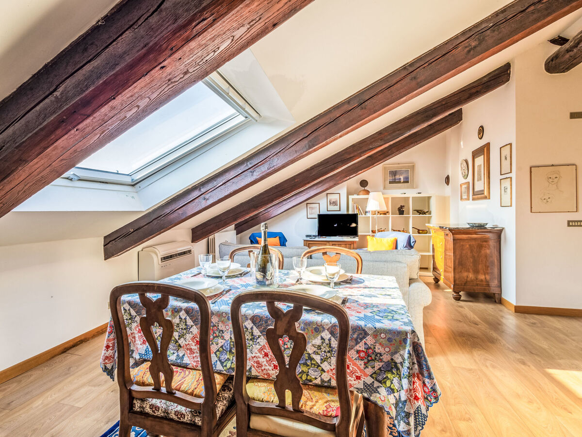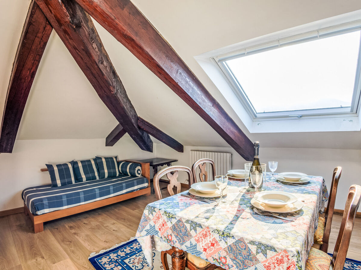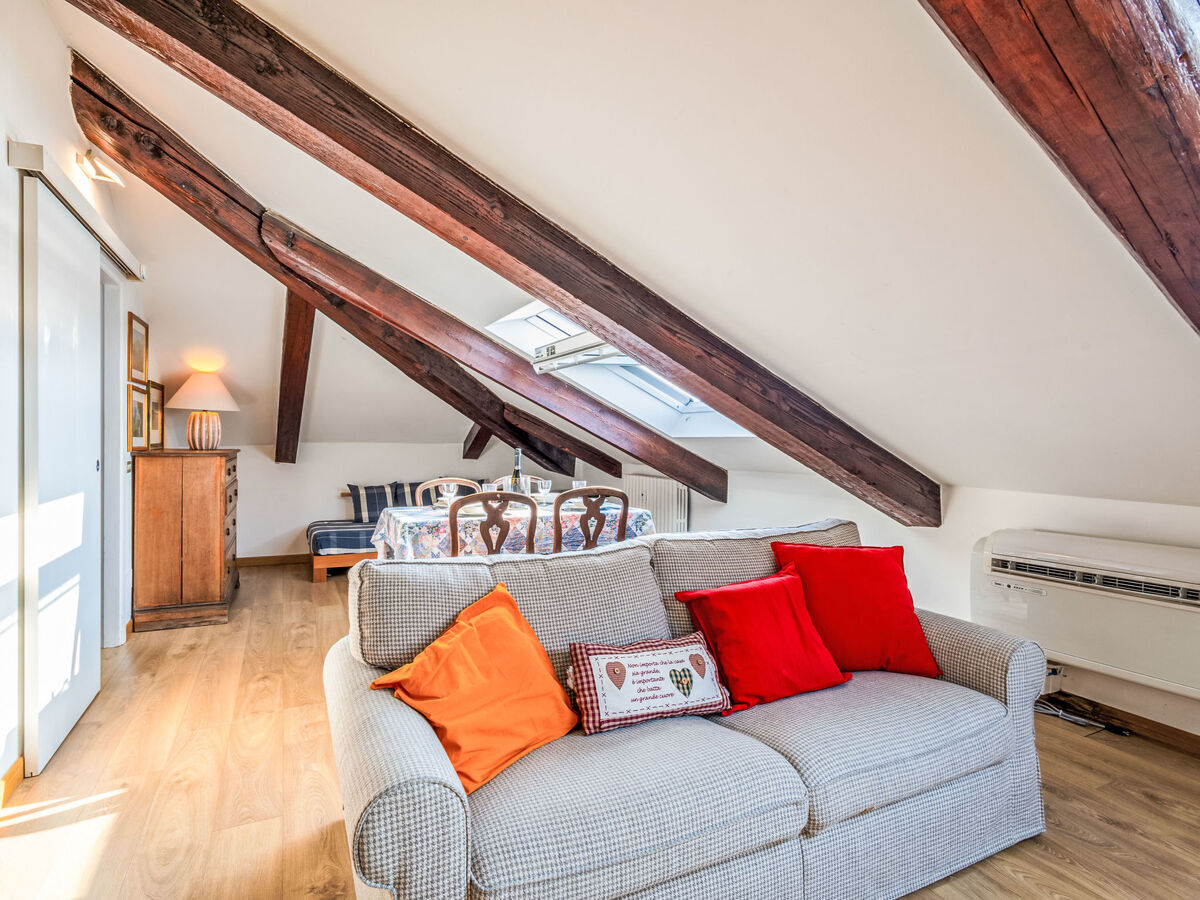Mansardé, aménagement confortable: séjour/salle à manger avec 1 divan-lit double, table pour les repas, TV et air-conditionné.