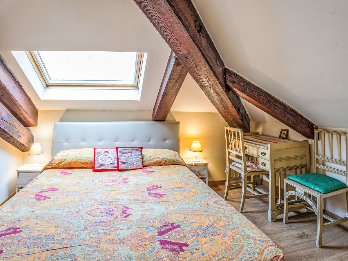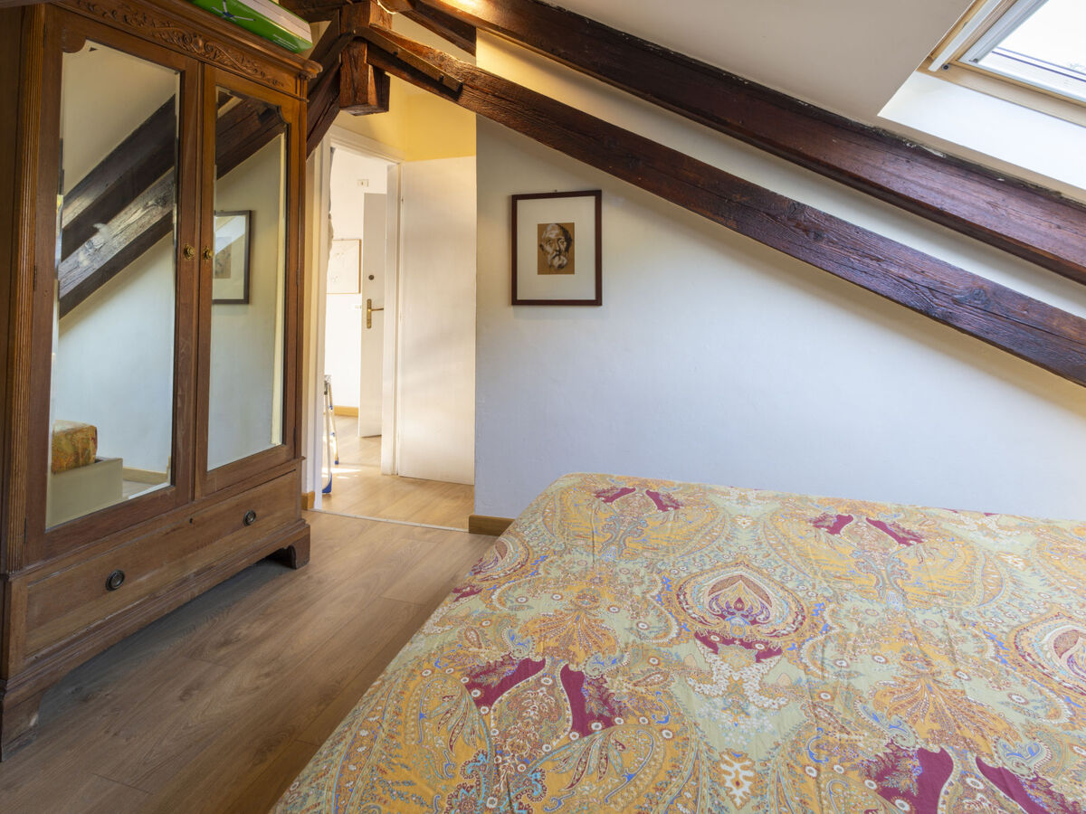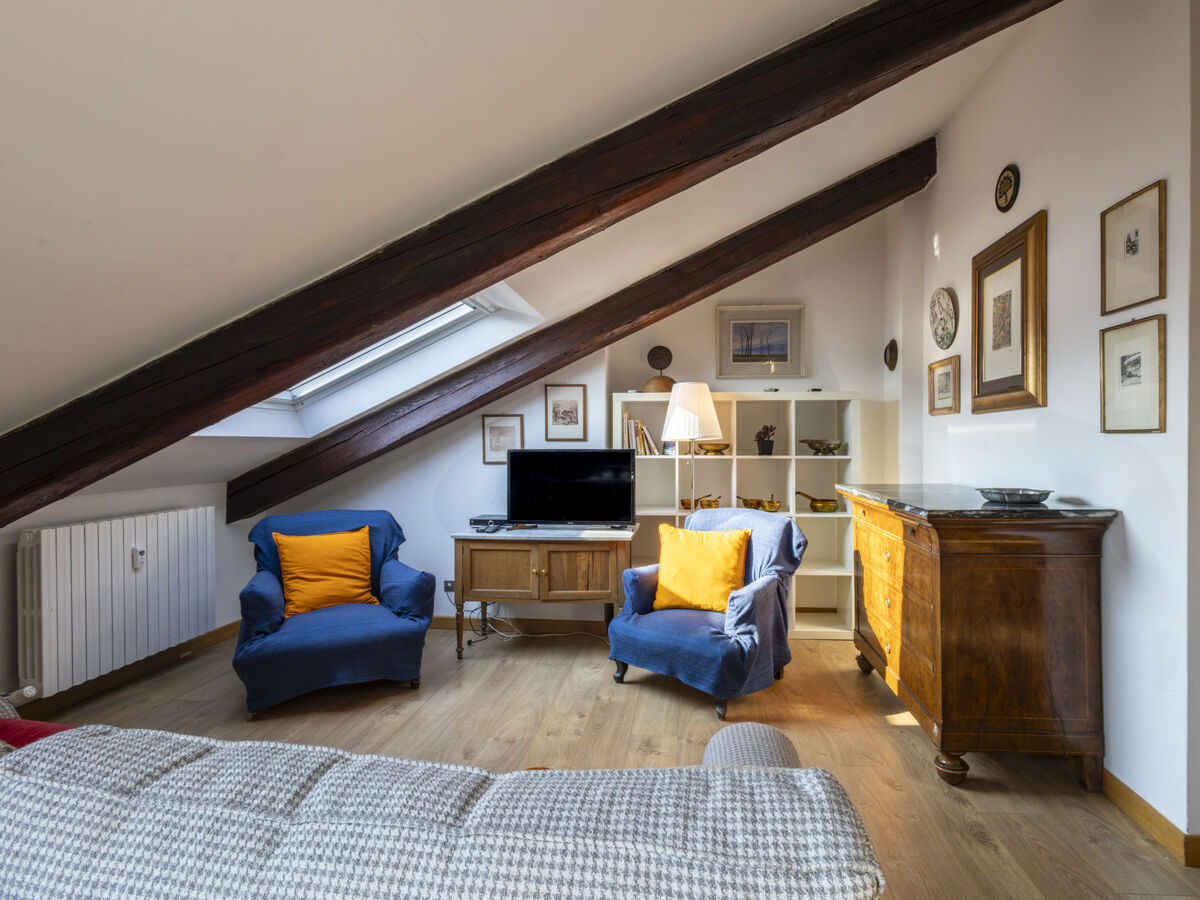 Mansardé, aménagement confortable: séjour/salle à manger avec 1 divan-lit double, table pour les repas, TV et air-conditionné.