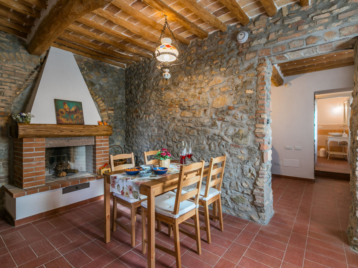 Séjour/salle à manger avec cheminée et table pour les repas.