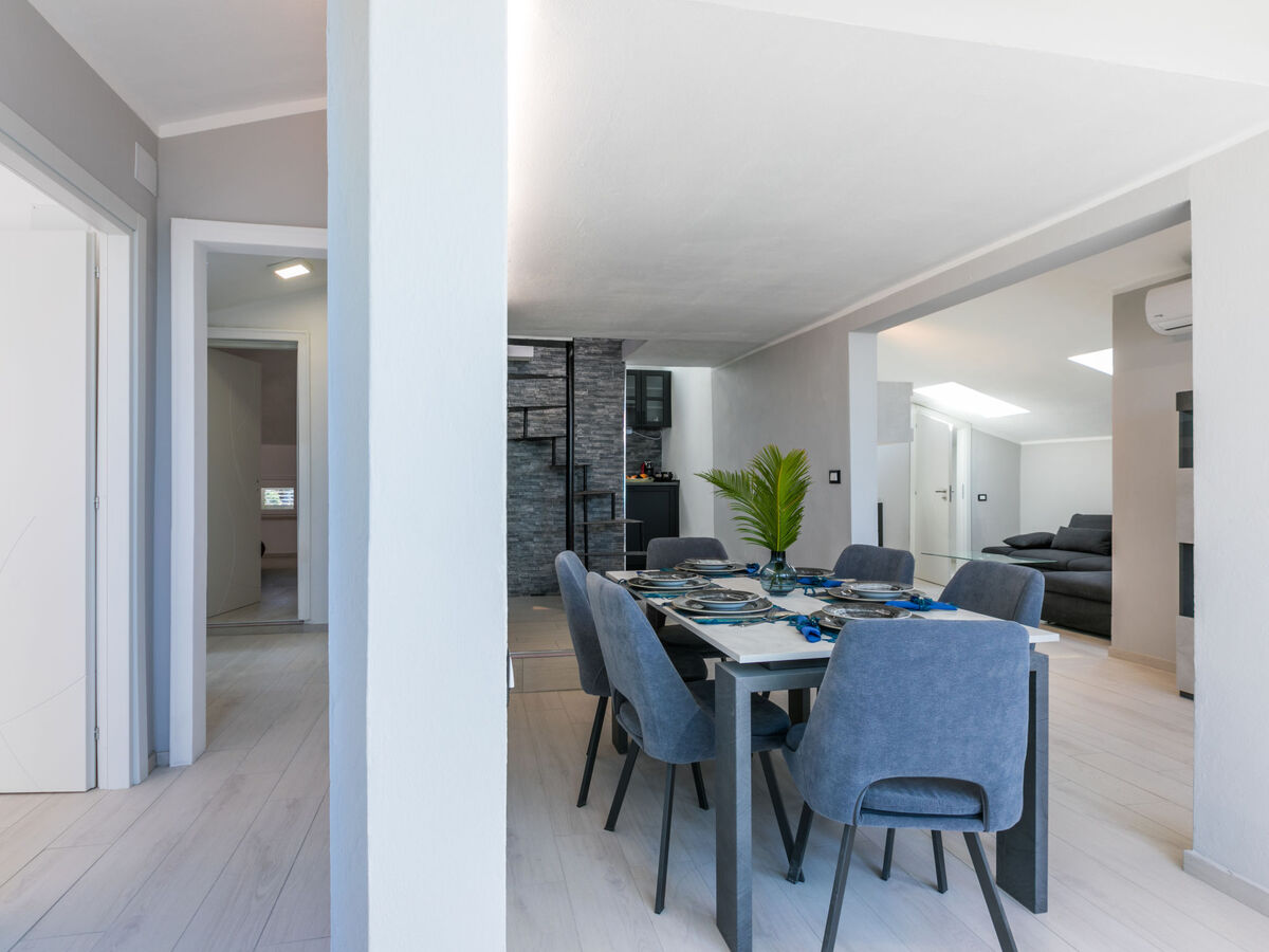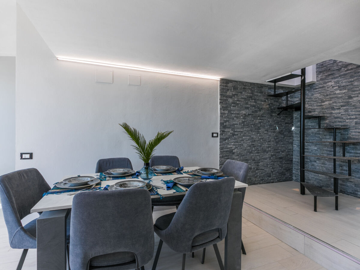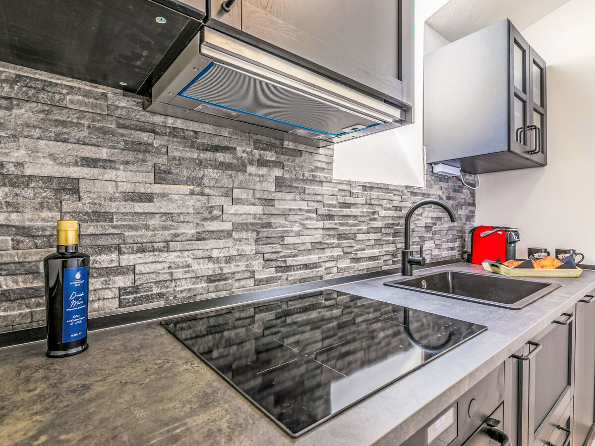 Cuisine ouverte (four, 4 plaques à induction, grille-pain, bouilloire électrique, cafetière électrique) avec table pour les repas.