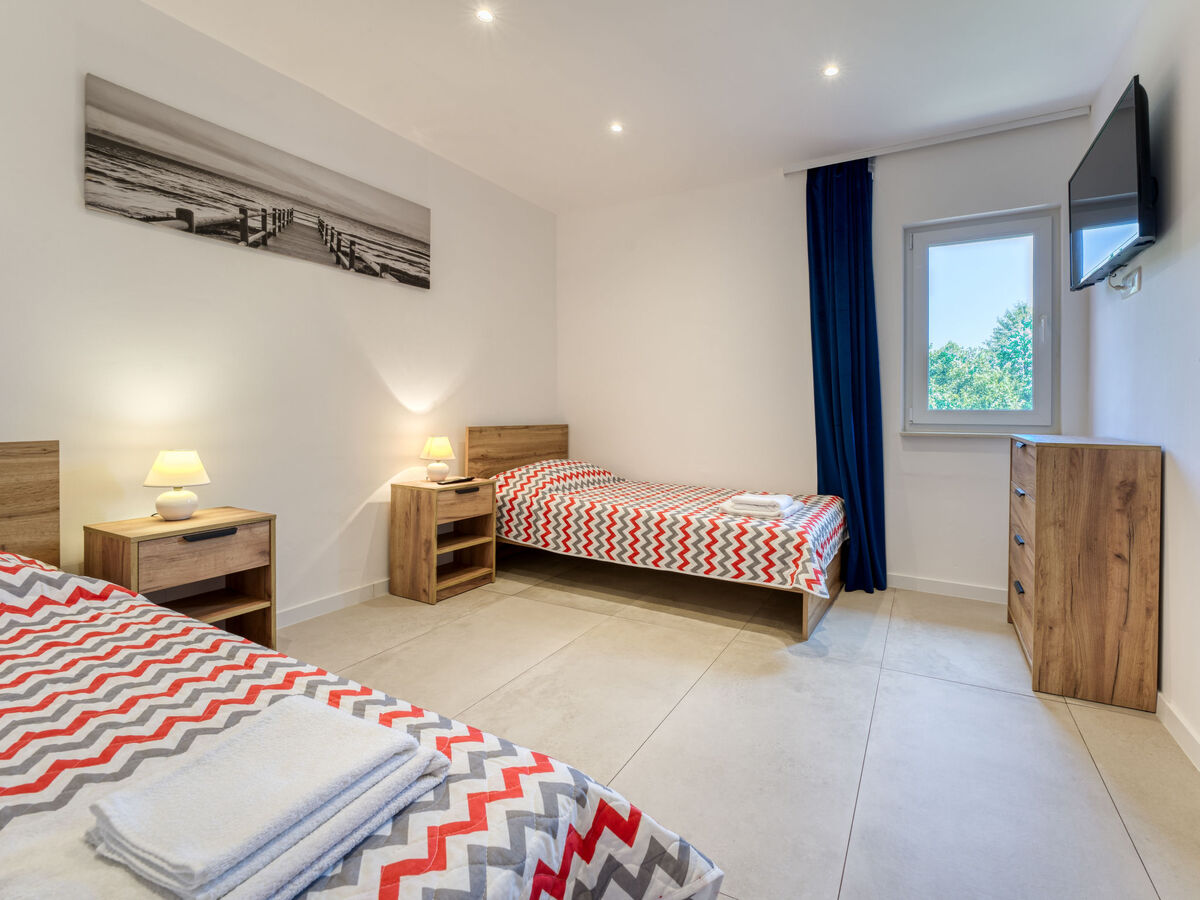 1 chambre, sans armoire avec 2 lits (90 cm, longueur 200 cm), TV (câblée).