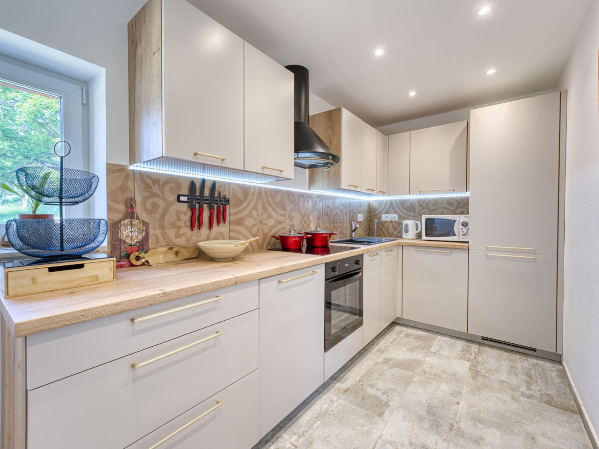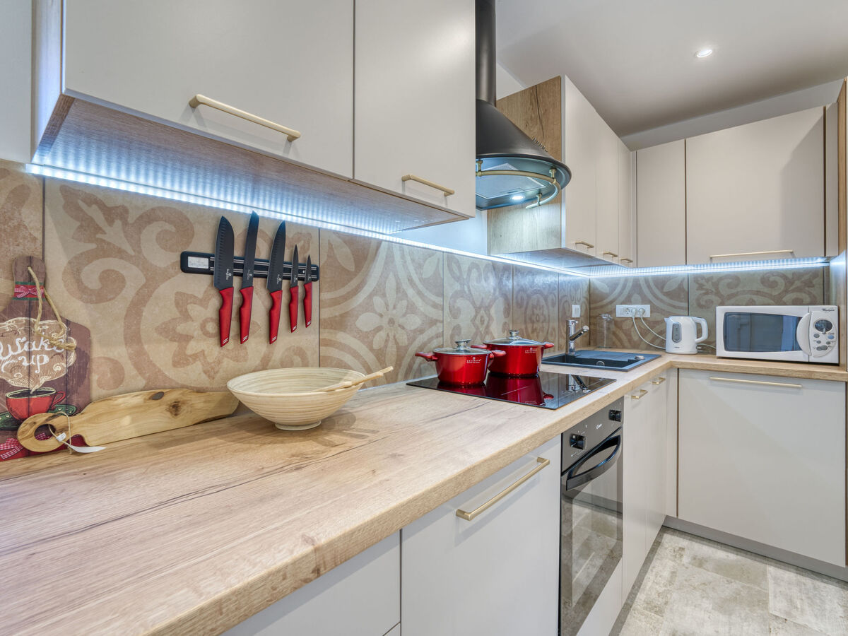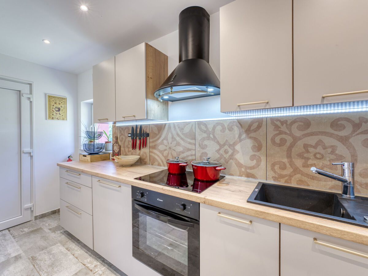 Cuisine ouverte (four, lave-vaisselle, 4 plaques à induction, grille-pain, bouilloire électrique, congélateur, cafetière électrique).