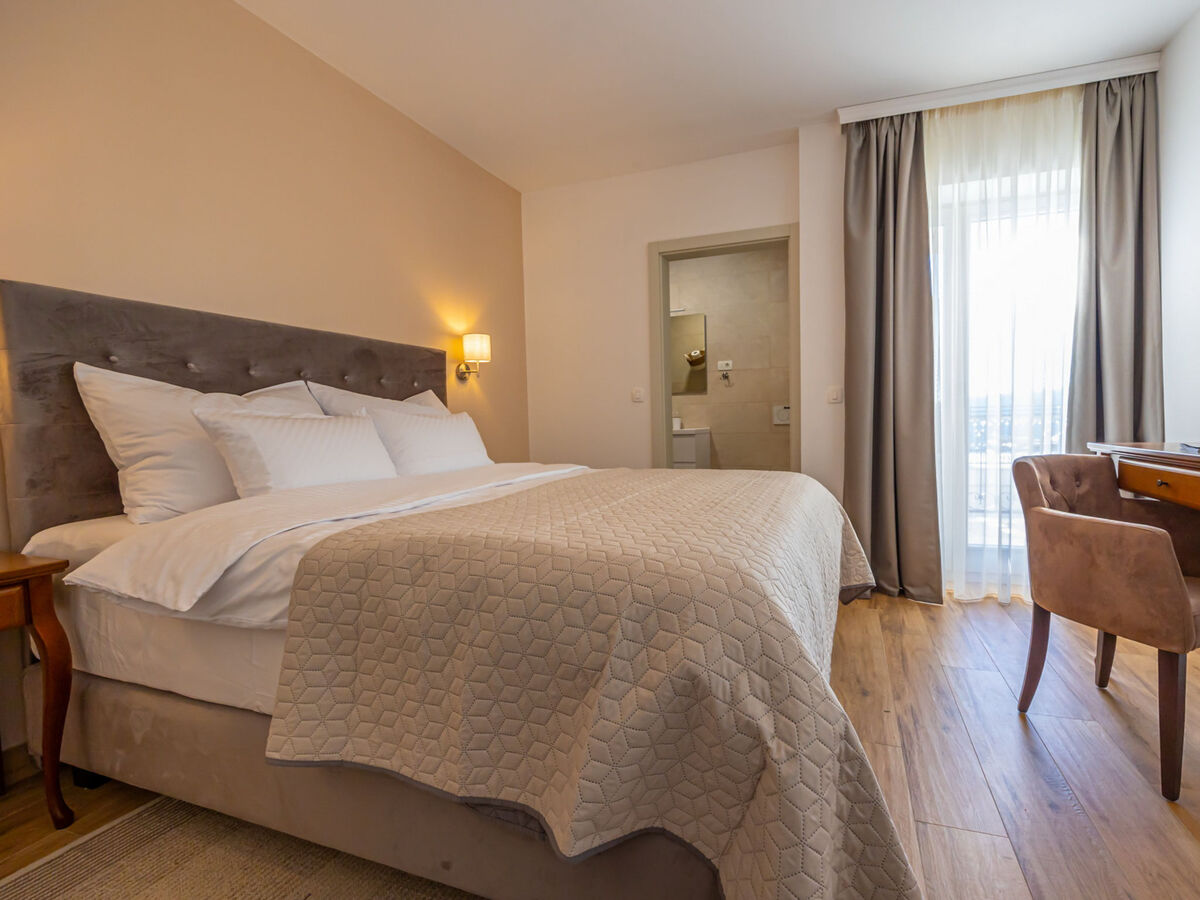 1 chambre avec 1 lit double (2 x 90 cm, longueur 200 cm), bain/douche/bidet/WC.