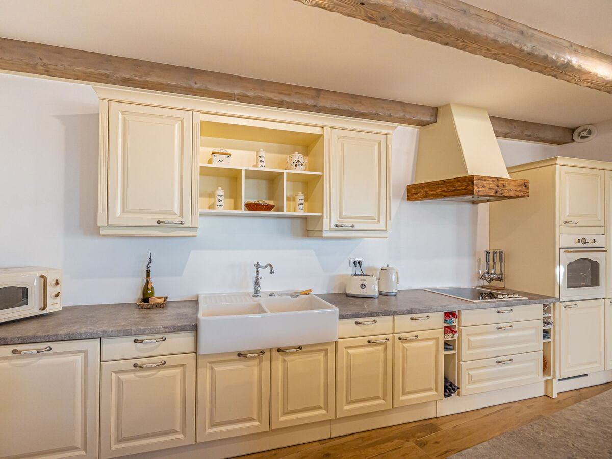 Cuisine ouverte (four, lave-vaisselle, 4 plaques à induction, grille-pain, bouilloire électrique, micro-ondes, congélateur, cafetière électrique).