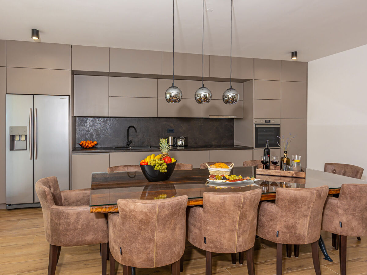 Cuisine ouverte (four, lave-vaisselle, 4 plaques vitrocéramiques, grille-pain, bouilloire électrique, micro-ondes, congélateur, cafetière électrique).