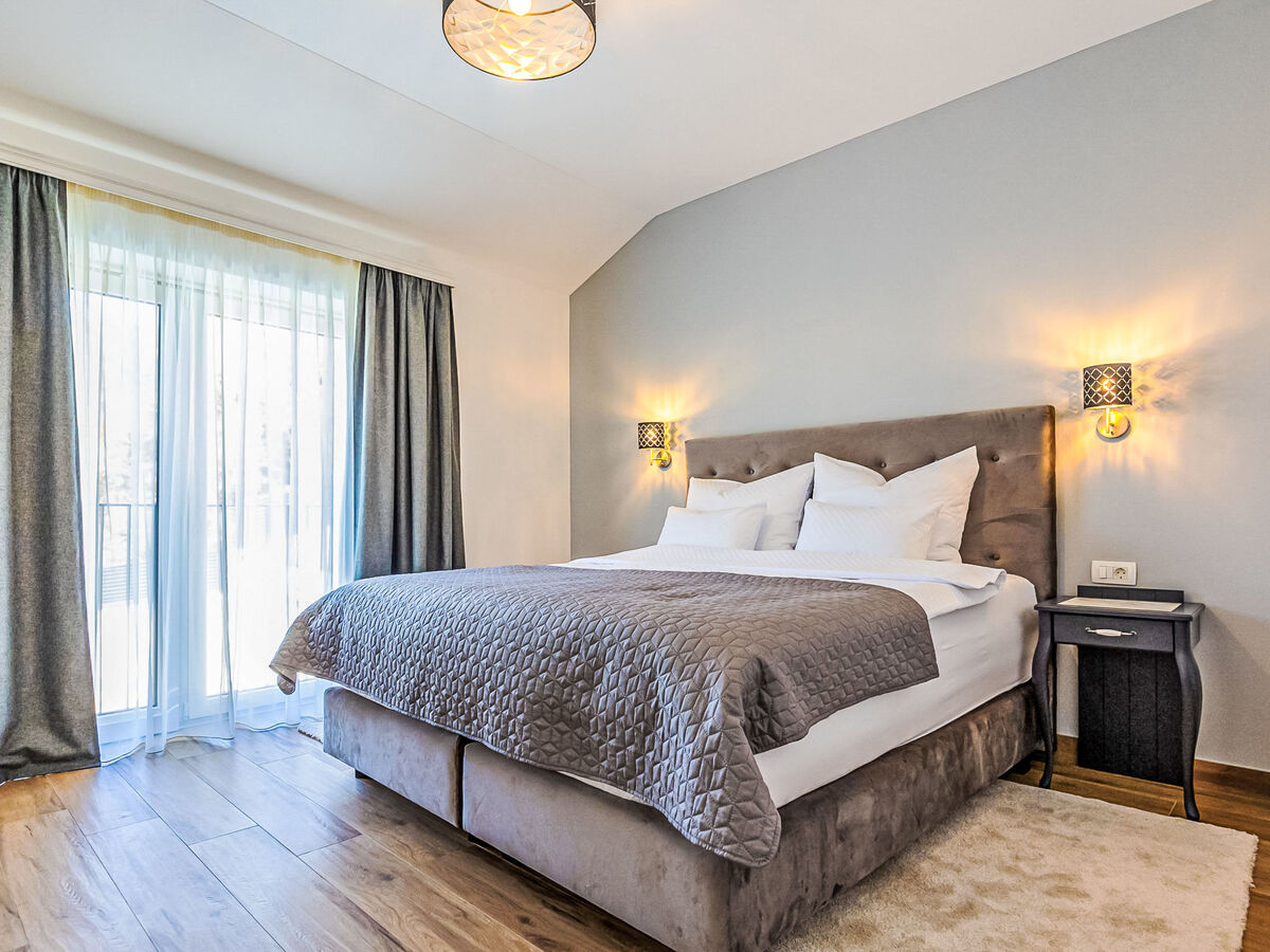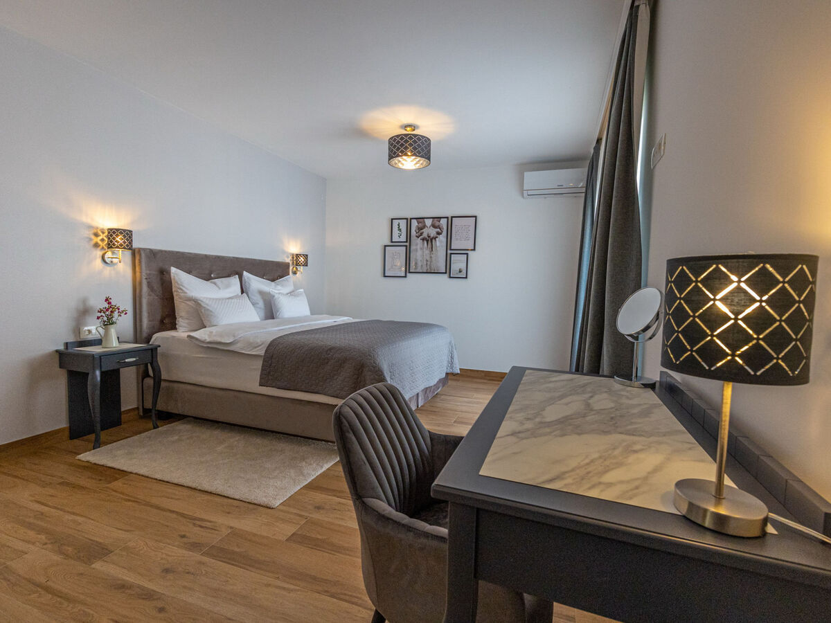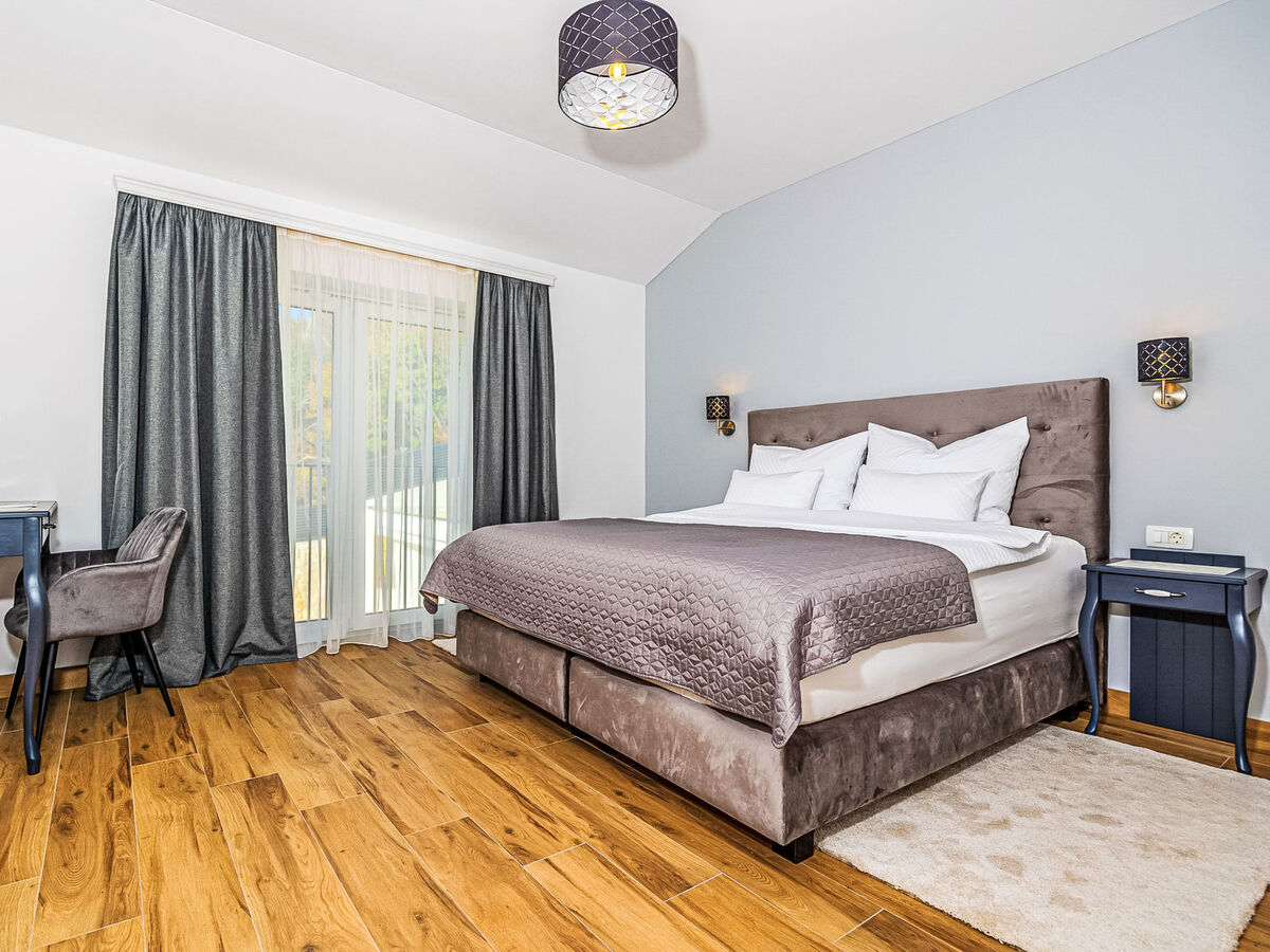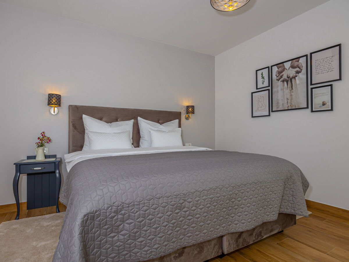 1 chambre avec 1 lit double (2 x 90 cm, longueur 200 cm), douche/WC.