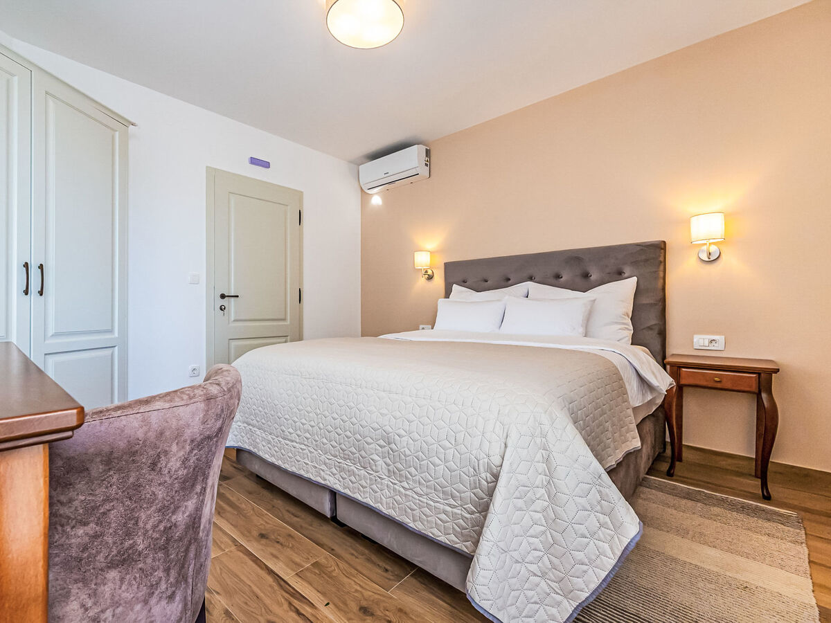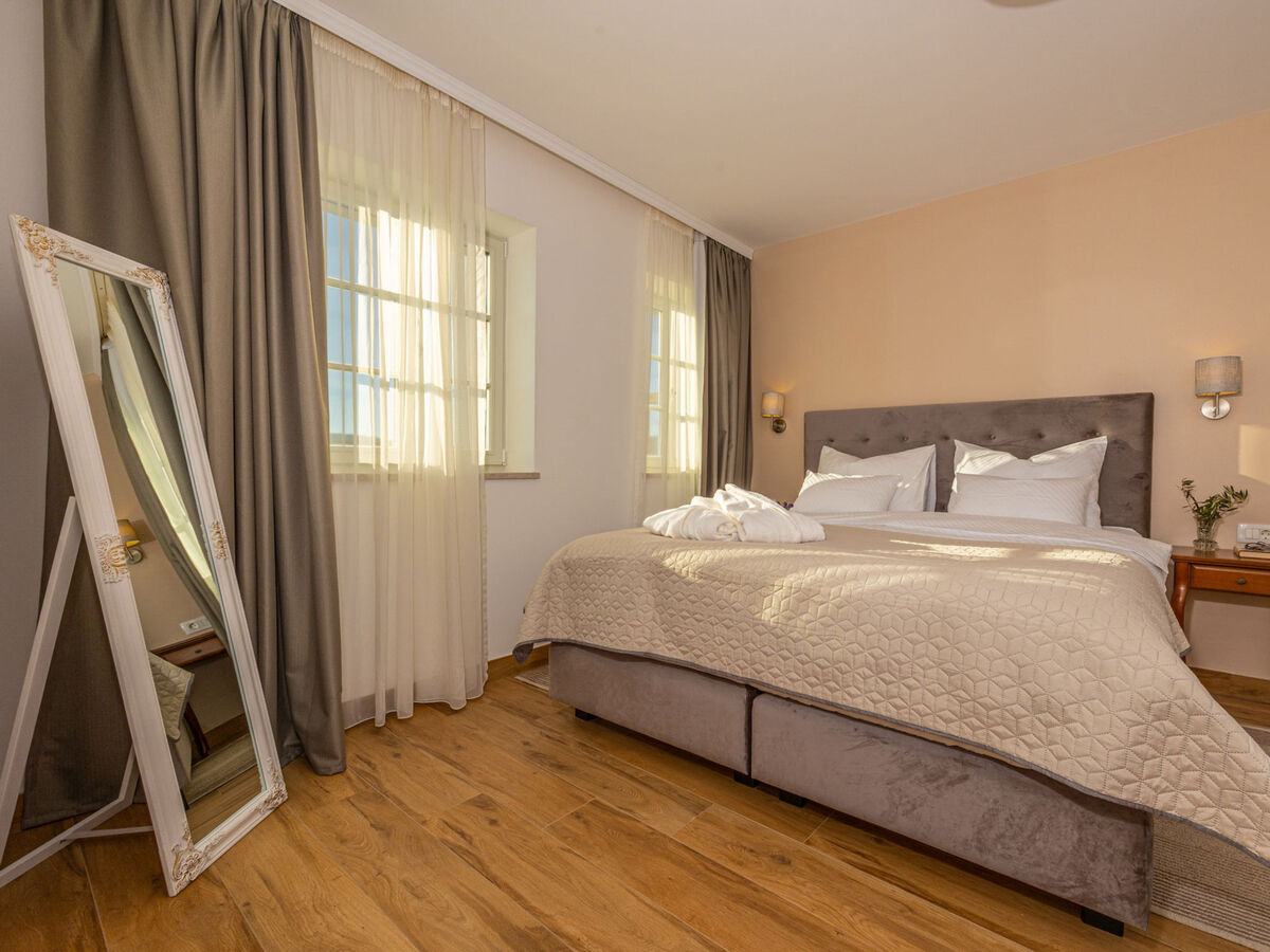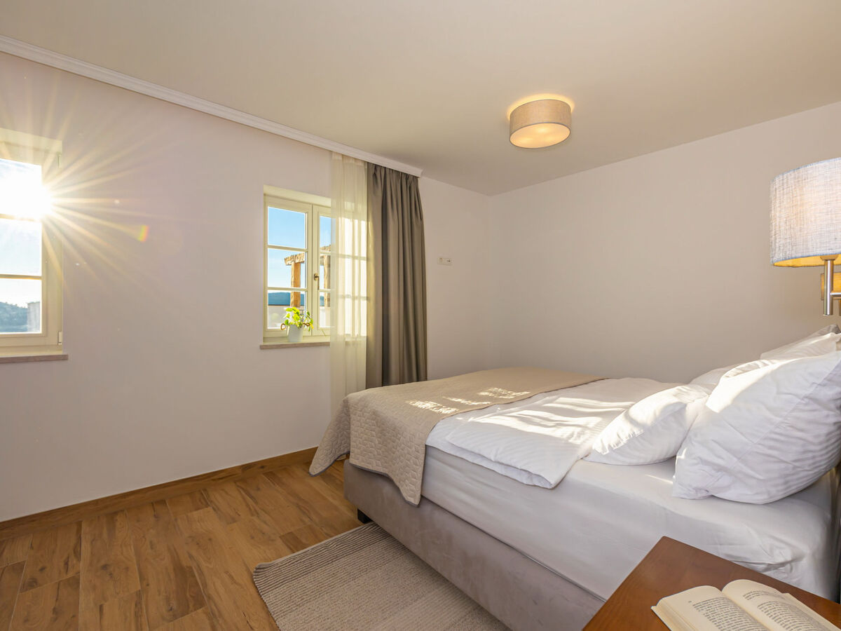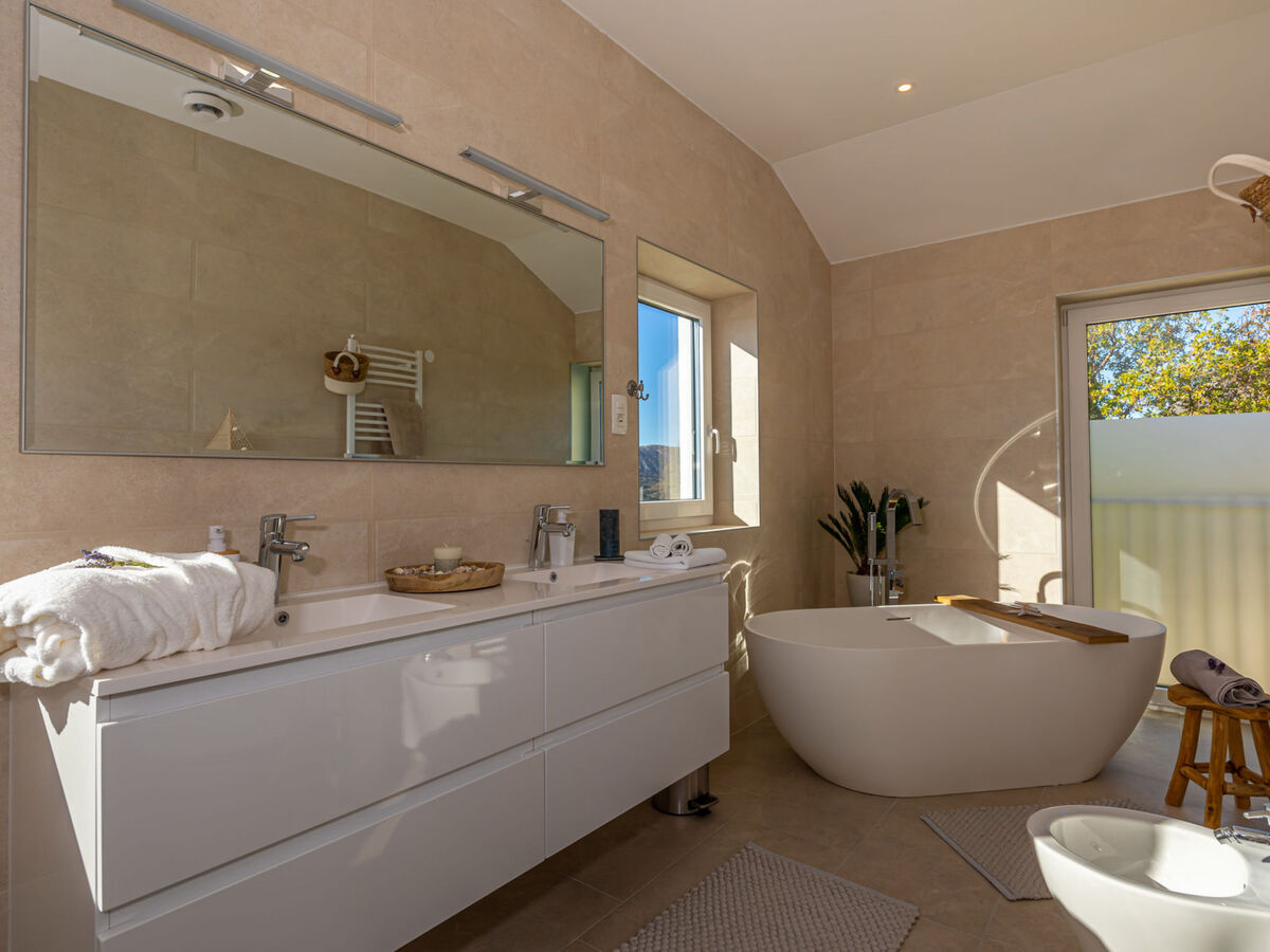 1 chambre avec 1 lit double (2 x 90 cm, longueur 200 cm), bain/douche/bidet/WC.